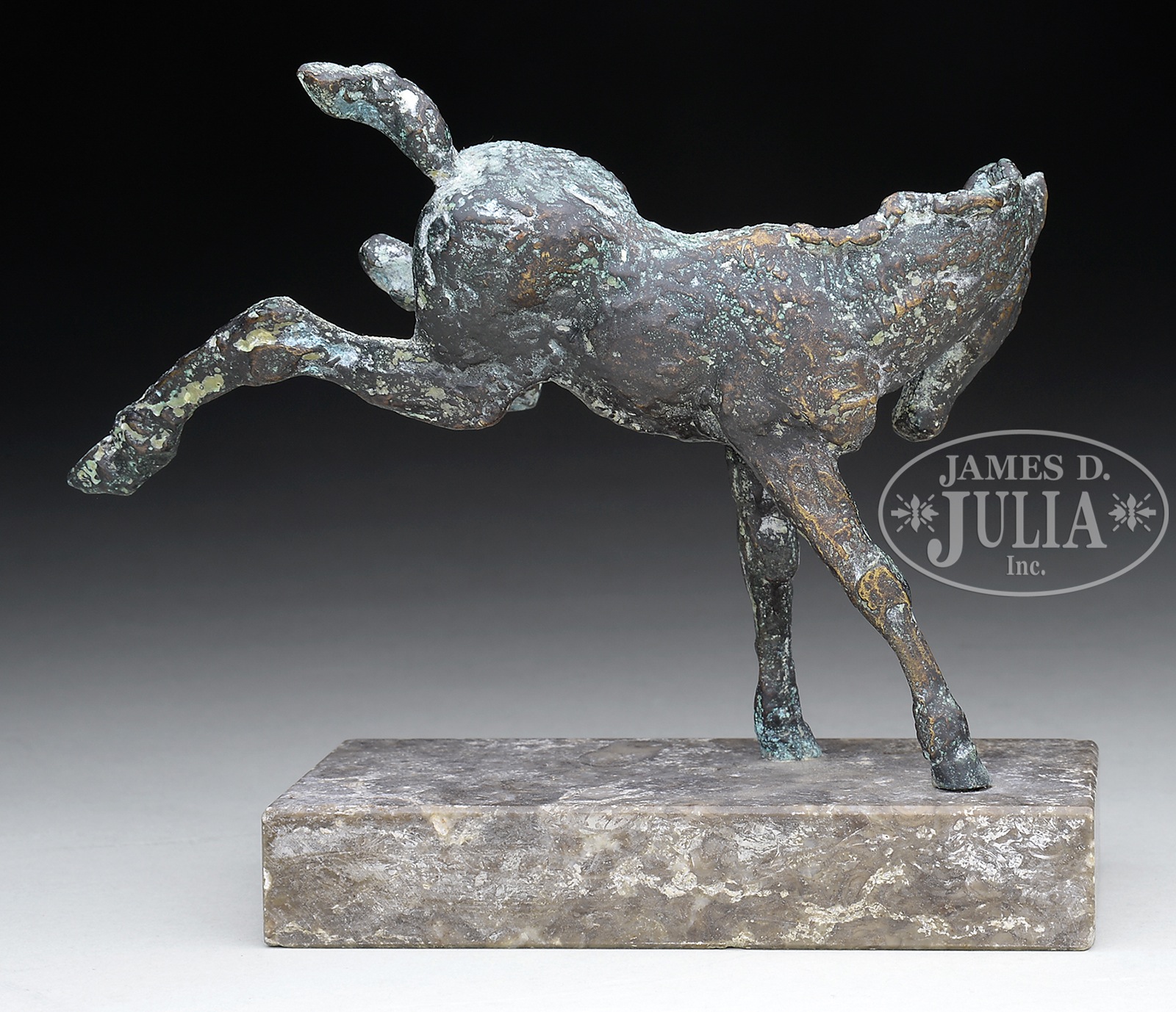 RENEE SINTENIS (American/German, 1888-1965) “AUSSCHLAGENDES FOHLEN”.Bronze Mounted to a marble rectangular slab Signed “RS” on side of hoof REFERENCE: Illustrated on page 31 of the book “Renee Sintenis” by Hannah Kiel, 1935. A copy of this book accompanies the work SIZE: Bronze: 4-1/4″ h x 6″ l PROVENANCE: Acquired in Germany, by descent to our consignor CONDITION: A wonderful spotted verdigris patina from being on a window sill in St. Martin 50414-2 (6,000-9,000) – Lot 1216