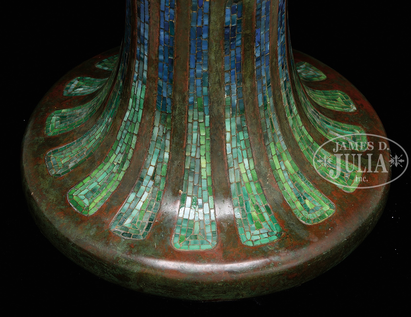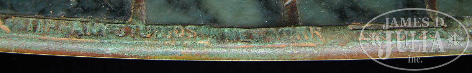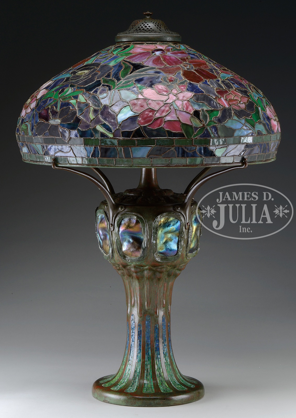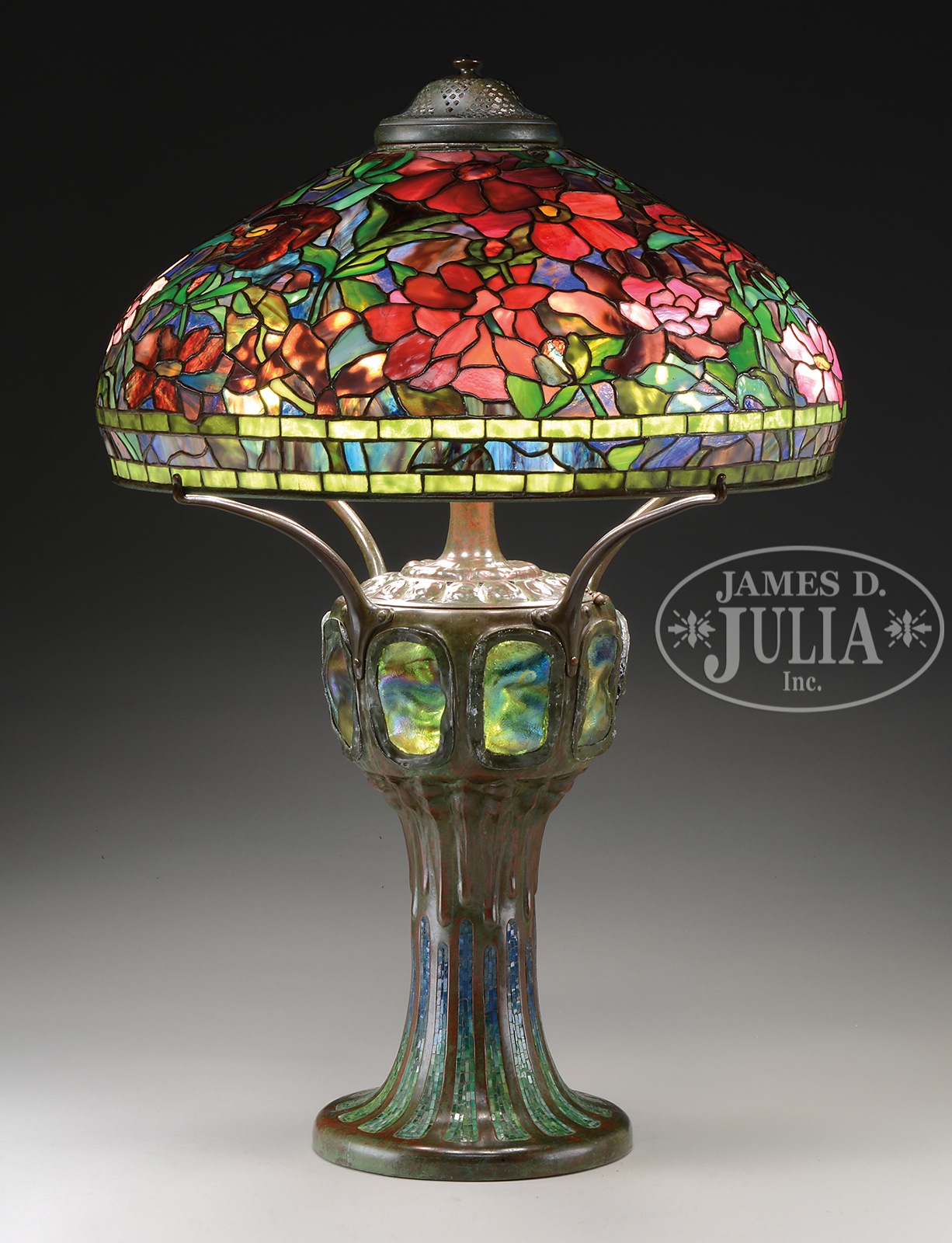 Please Note: Upon closer examination, we noted that one rectangular tile in the geometric border has been replaced. TIFFANY STUDIOS PEONY TABLE LAMP WITH RARE MOSAIC TURTLEBACK BASE.Tiffany Studios table lamp has leaded glass shade with rich red, pink and white peony flowers and buds with green striated and mottled leaves all set against a blue and green background. Shade is signed on inside edge “Tiffany Studios New York 1505-25”. Shade rests on a rare Tiffany Studios #355 base with vertical mosaic panels of green shading to blue. The body of the base is set with eight green turtleback tiles with blue iridescent exteriors. Base is completed with a four arm spider and six socket cluster as well as a single socket to illuminate the interior of the base. All finished in rich brown patina with red and green highlights. Lamp is topped with original acid etched cap. Socket cluster and top of base are removable, and inside of removable top as well as inside of base are stamped with the number “1”. Signed on the underside “Tiffany Studios New York”. SIZE: Shade is 22″ dia. Lamp is 33″ t. CONDITION: Shade is very good with some tight hairlines and no missing glass. Base has oxidation to leading around turtlebacks, some loose as a result, otherwise very good to excellent. 51088-30 (150,000-250,000) – Lot 1216