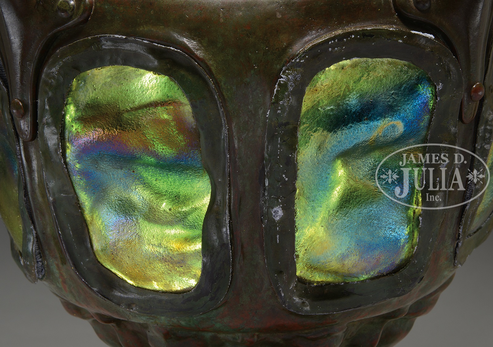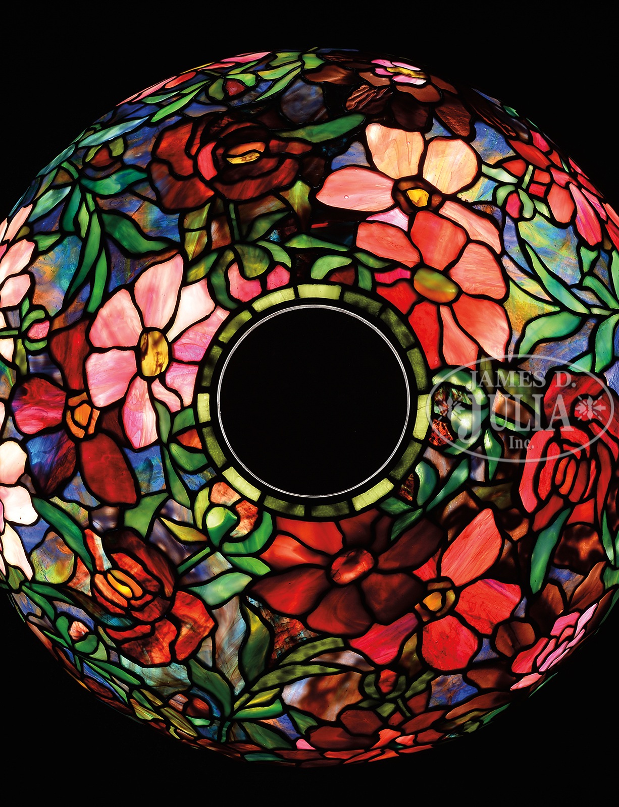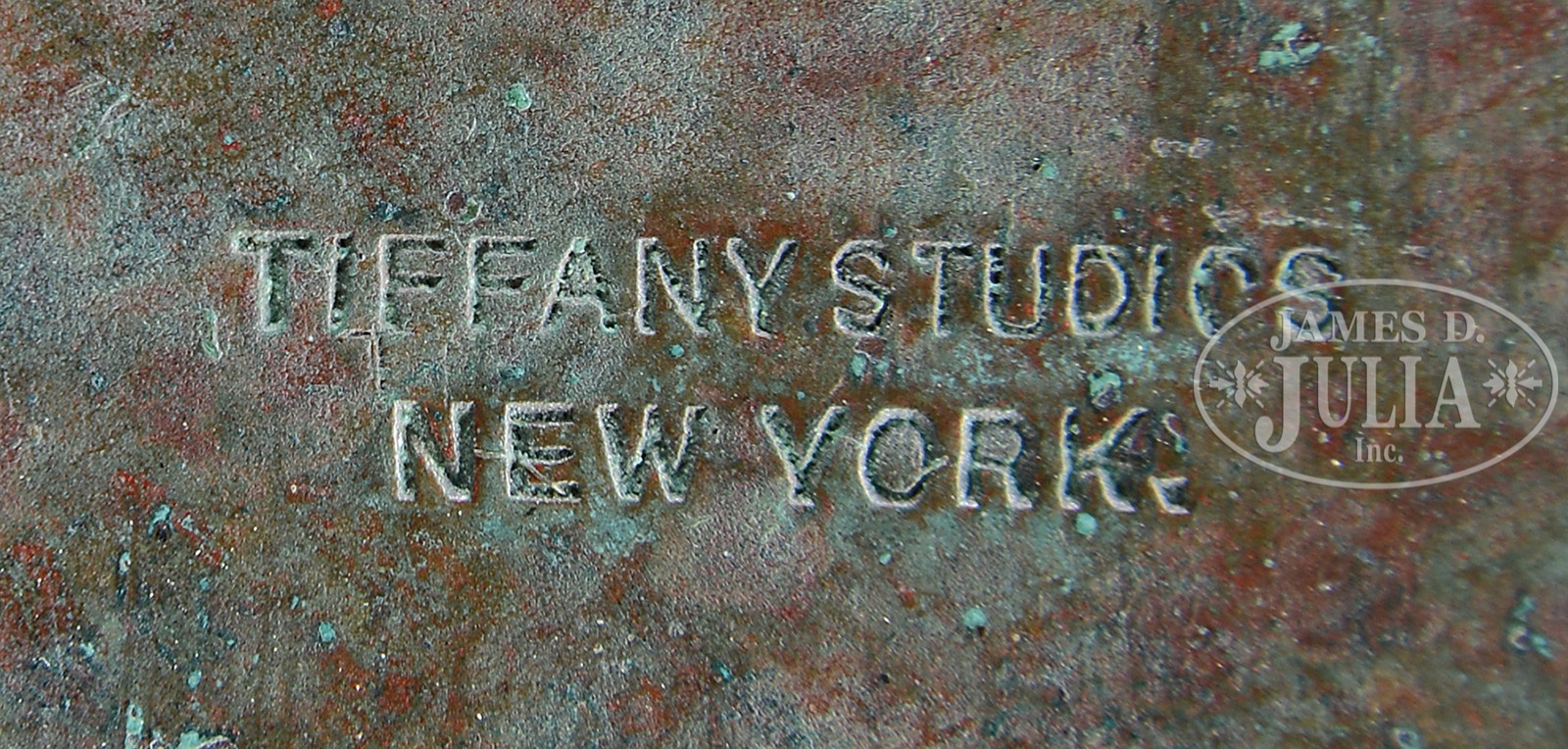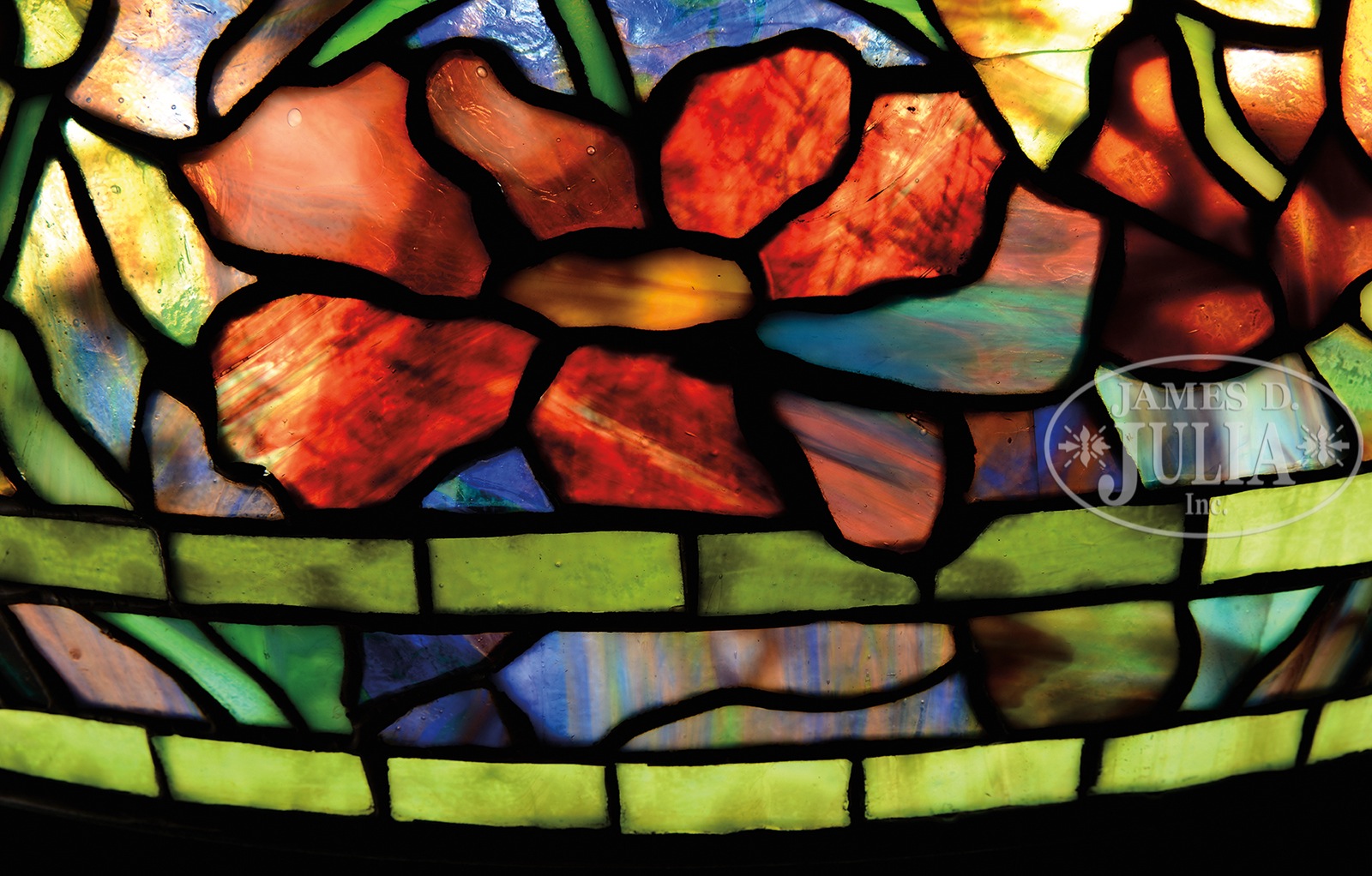 Please Note: Upon closer examination, we noted that one rectangular tile in the geometric border has been replaced. TIFFANY STUDIOS PEONY TABLE LAMP WITH RARE MOSAIC TURTLEBACK BASE.Tiffany Studios table lamp has leaded glass shade with rich red, pink and white peony flowers and buds with green striated and mottled leaves all set against a blue and green background. Shade is signed on inside edge “Tiffany Studios New York 1505-25”. Shade rests on a rare Tiffany Studios #355 base with vertical mosaic panels of green shading to blue. The body of the base is set with eight green turtleback tiles with blue iridescent exteriors. Base is completed with a four arm spider and six socket cluster as well as a single socket to illuminate the interior of the base. All finished in rich brown patina with red and green highlights. Lamp is topped with original acid etched cap. Socket cluster and top of base are removable, and inside of removable top as well as inside of base are stamped with the number “1”. Signed on the underside “Tiffany Studios New York”. SIZE: Shade is 22″ dia. Lamp is 33″ t. CONDITION: Shade is very good with some tight hairlines and no missing glass. Base has oxidation to leading around turtlebacks, some loose as a result, otherwise very good to excellent. 51088-30 (150,000-250,000) – Lot 1216