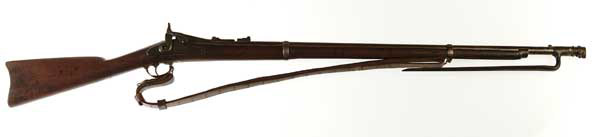 SPRINGFIELD 2ND ALLEN CONVERSION WITH BAYONET. NSN. Cal. .50-70, 32-5/8″ round bbl. Missing the ramrod but has a later sling added. Dated 1864 on the lock, 1866 on the breech block. CONDITION: Gray patina overall with light surface rust and pitting. Wood has been repaired at the wrist, heavily sanded and re-oiled. Bayonet has been shortened to 14-1/2″. 4-46002 FS332 (250-400)