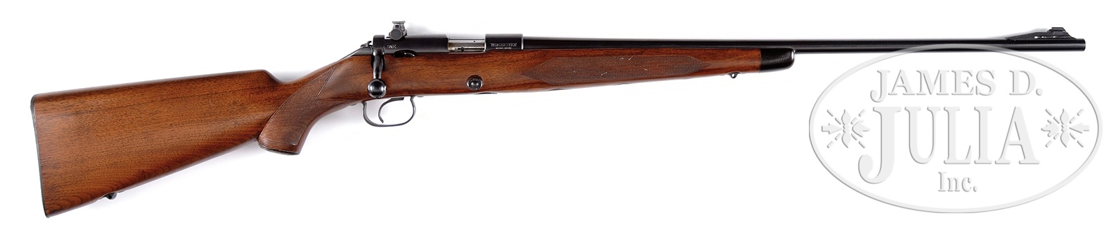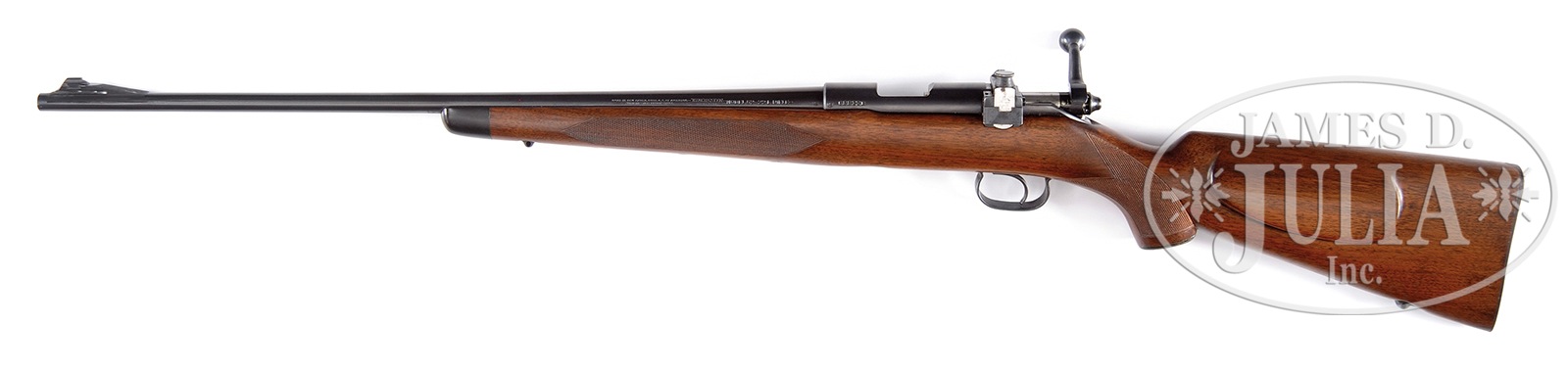 *FINE WINCHESTER MODEL 52B SPORTER BOLT ACTION RIFLE.SN 68832B. Cal. 22 LR. 24″ rnd bbl, front ramp with Lyman sporting bead sight, hood missing, Lyman 48F receiver sight. Bolt with matching SN. Correct Winchester mag. Floorplate marked “SPORTING”. Monte Carlo buttstock with capped checkered pistol grip with ebony forend tip. Diamond checkering pattern on underside of forend. Super Grade sling swivel bases. Steel checkered buttplate. PROVENANCE: Remarkable William Larkin Moore Private Estate Collection of Fine Sporting Arms. CONDITION: Fine. Rifle retains nearly all of its bbl and receiver blue, as does the bolt, floorplate and trigger bow. Buttstock is fine with scattered handling marks. Light wear and fine oxidation on buttplate. Mechanics are crisp. Bright bore, sharp rifling. 50595-51 TJW (3,000-4,500) C&R – Lot 1218