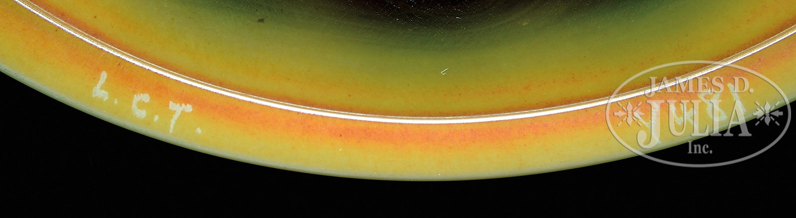 TIFFANY FLOWER FORM VASE.Tiffany flower form vase has inverted saucer foot with green opalescence at the edge and a green pulled feather design against a translucent gold iridescent ground. Slender transparent green stem has subtle pulled feather lines and leads to green pulled feathers surrounding the bowl. Bowl has white opalescence at bottom and top and a center band of gold translucent iridescence showing nice red highlights. Signed on underside “L.C.T. Y481”. This newly discovered vase consigned from Pennsylvania was a wedding present to our consignor’s grandparents in the 1920s. It has been in the family’s possession continuously, inherited in 1972 by our consignor. SIZE: 16-3/4″ t. CONDITION: Very good to excellent. 49715-1 (4,000-6,000) – Lot 1220