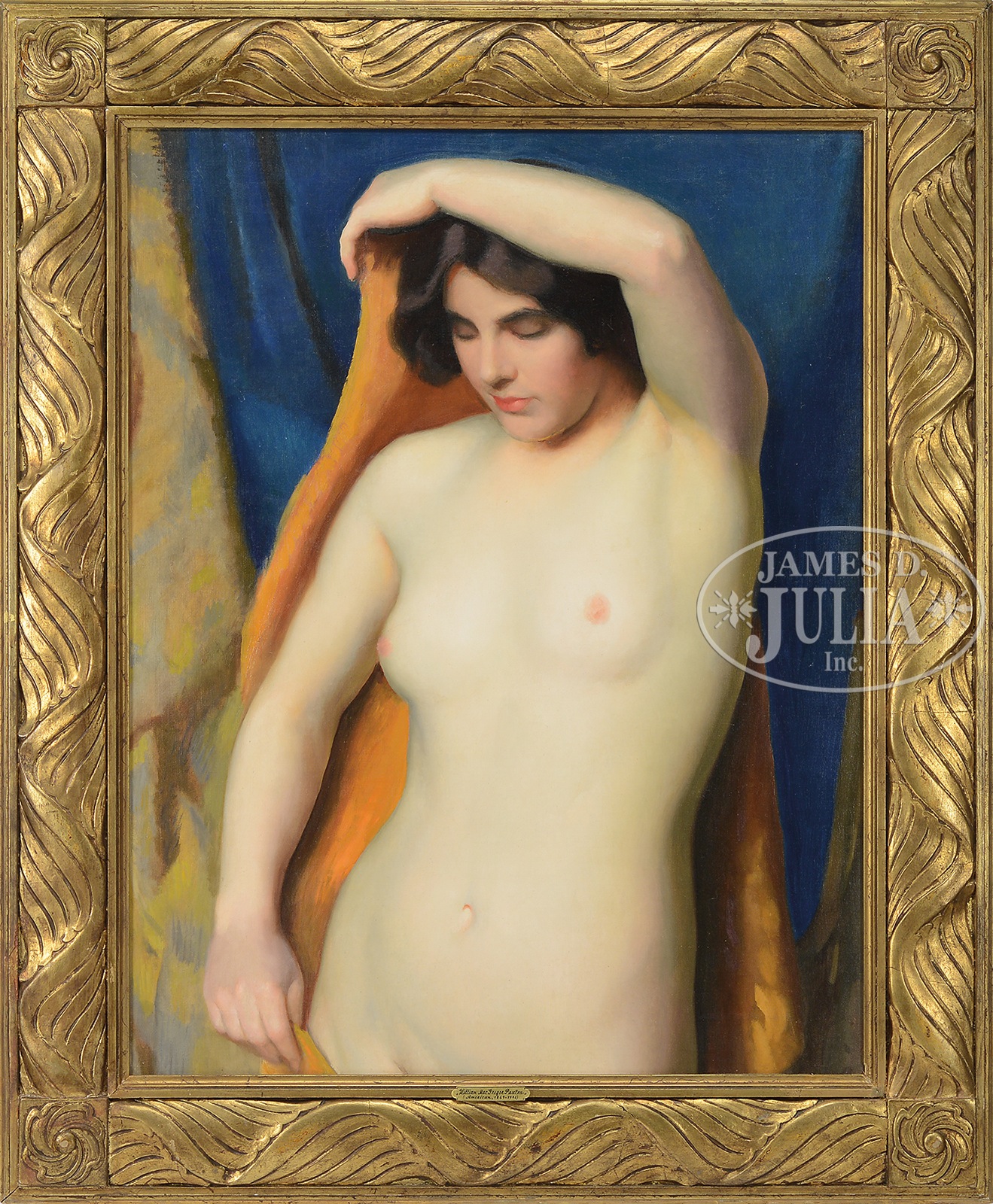 Please Note: Good News! This painting was illustrated on the back cover of Vose Galleries Exhibition “The Boston School Tradition, Truth, Beauty & Timeless Craft” June 6 – July 18, 2015. WILLIAM MCGREGOR PAXTON (American, 1869-1941) “THE GOLDEN VEIL” (ALTERNATIVE TITLE: “GIRL WITH GOLD DRAPERY”).Oil on canvas Housed in a carved and gilt wood frame Unsigned, original labels attached to foam core backing board from Hirschl & Adler; Abby M Taylor Fine Art; and two from Vose Galleries of Boston. SIZE: 32″ x 26″. Overall: 40″ x 33″ CONDITION: Lined, some inpainting, very good 50808-1 (30,000-50,000) – Lot 1221