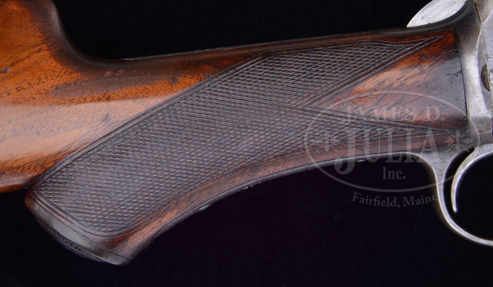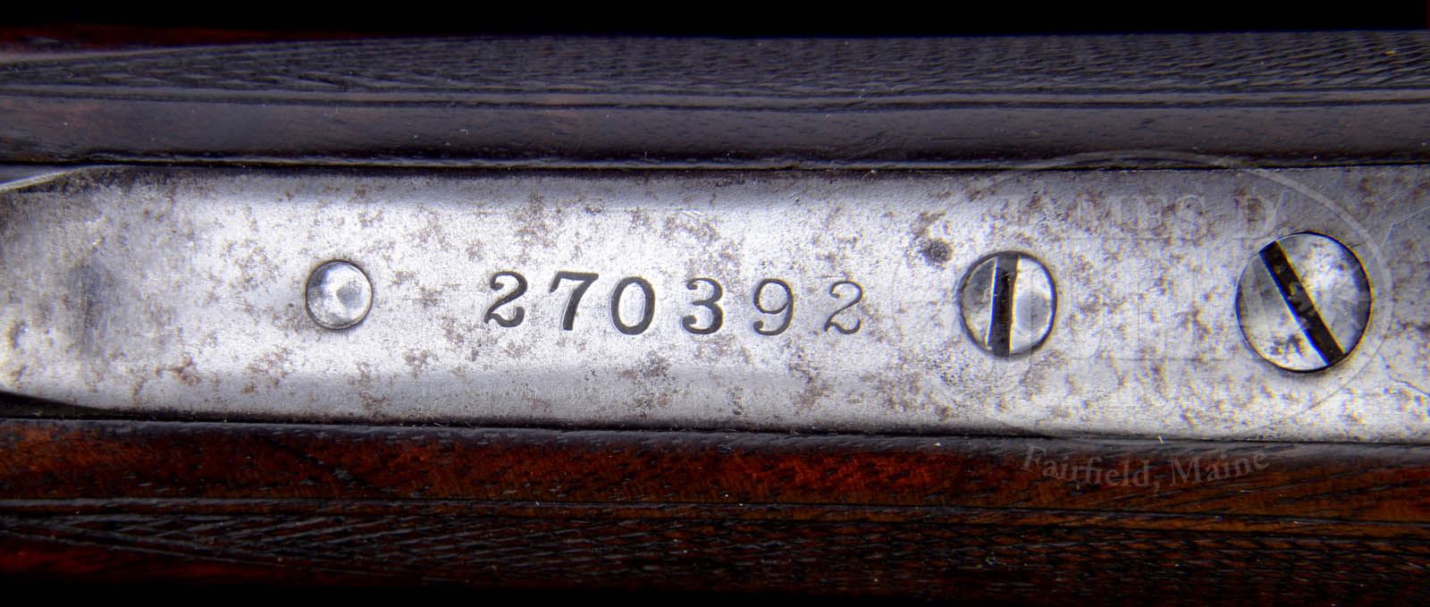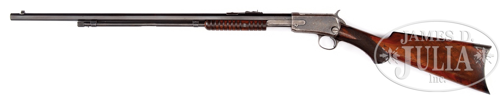 *WINCHESTER SECOND MODEL DELUXE 1890 SLIDE ACTION RIFLE.SN 270392. Cal. 22 WRF. 24″ oct bbl, standard sights with replaced elevator. Second model takedown receiver stamped “WRF” on face. Round ribbed forend. Nicely figured capped pistol grip buttstock with Winchester logo cap. Crescent buttplate. CONDITION: Good plus. Bbl retains much orig thinning blue, wear on high edges. Mag tube retains thinning blue. Receiver with nice orig blue which is thinning & flaking, light surface pitting. Wood is sound, showing moderate wear with much orig varnish. Normal handling marks. Bore is dark with rifling present. 51014-3 TJW (2,000-3,000) C&R – Lot 1221