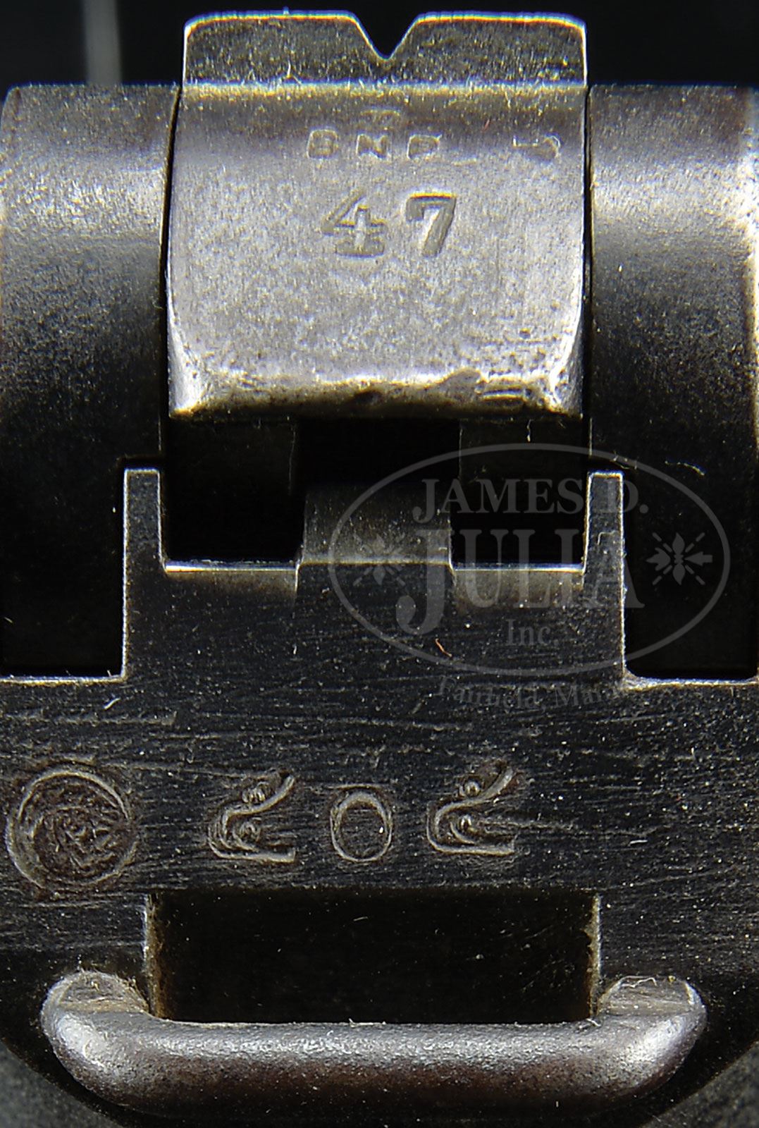 *◊ BANGKOK POLICE MARKED DWM 1906 DUTCH EAST INDIES ARMY M11 LUGER.SN 1738. Cal. 9mm. 4″ bbl with British proofs and full SN on bottom. “1937” date on top. DWM scroll on center toggle link. British proofs on toggle assembly and receiver. Crown/W on right receiver. Full SN and British proofs on front of frame. “Mgd.Tmi./143” Dutch Indies Unit mark on brass plaque on left side of frame. “RUST” marked safety, extractor GELADEN marked both sides. Numbered parts on frame are matching to bbl and receiver. Toggle assembly is mismatched with number “47”s. “GS” marked toggle pin. Coarse checkered walnut grips have 4-digit SNs that match the frame. Sideplate and trigger are unnumbered Ordnance replacements. Siamese lion’s head followed by “505” in Thai numerals (Bangkok Police, weapon number 505) on back of frame. This pistol was acquired by the Bangkok police after its service in Indonesia and bears a Thai Bangkok Police property number above those of the Mauser Thai contract pistols which run up to approximately 500. Proper Dutch wood bottom mag with retaining spring clip. This gun is featured on pp. 562 and 573 of Borchardt & Luger Automatic Pistols by Joachim Gortz and Dr. Geoffrey Sturgess. PROVENANCE: Collection of Dr. Geoffrey Sturgess. CONDITION: Fine, retaining 70% Dutch Arsenal blue with scattered light pitting. 10% straw is visible and is corroded overall. Grips are worn and oil soaked dark. Mag is very good with an area of pitting on body and wood bottom is very good with some minor dings. Bore has light wear and light pitting. Mechanics are sound. 4-52872 BWS44 (1,500-2,750) – Lot 1224