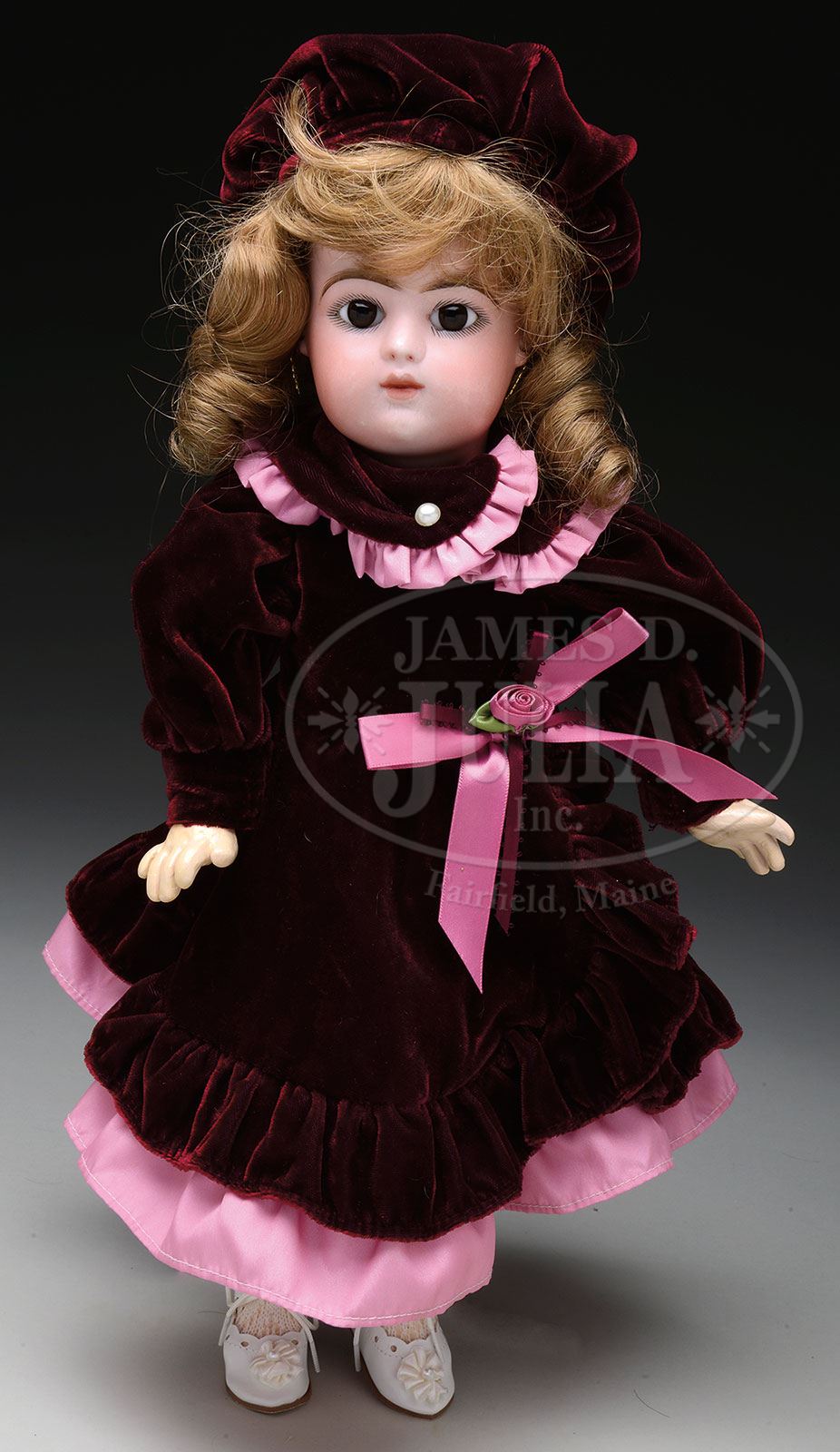 CLOSED MOUTH GAULTIER BEBE.Bisque socket head incised “F.G. (in a scroll) 7″ with brown paperweight eyes, evenly arched multi stroke eyebrows, pierced ears on original fully jointed wood and composition body with straight wrists. She has been re-costumed in a burgundy velvet dress with pink trim and rose silk ribbon sash. SIZE: 17” t (44cm). PROVENANCE: The Madelyn Trotter Collection. CONDITION: Slight unevenness in cheek color; body repainted. 1-14422 (1,500-2,500) – Lot 1225 Auction: Advertising, Toy & Doll Auction - Fall 2014 Please Note: All prices include the hammer price plus the buyer’s premium, which is paid by the buyer as part of the purchase price. The prices noted here after the auction are considered unofficial and do not become official until after the 46th day. |