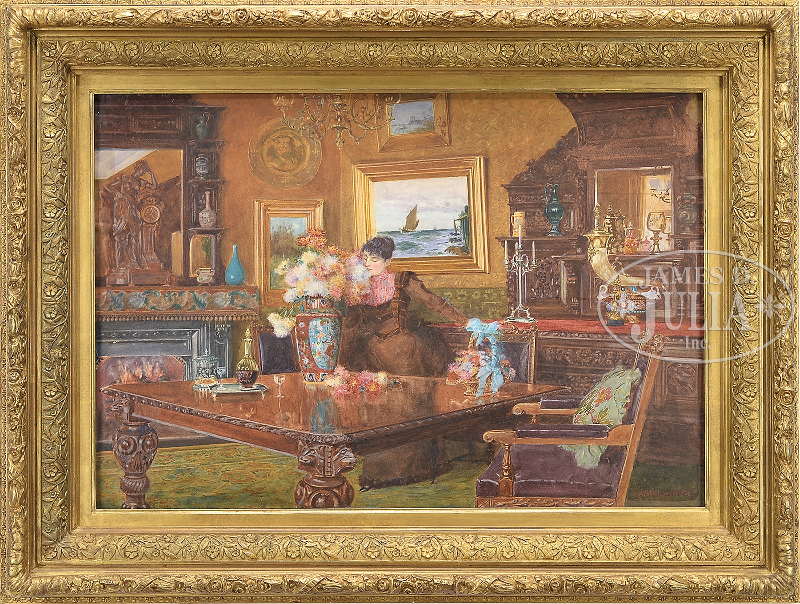 ALBERT HERTER (American, 1871-1950) WOMAN IN WELL APPOINTED INTERIOR.Watercolor on paper Housed in a period molded and giltwood frame Signed lower right “Albert Herter” SIZE: 20″ x 28-3/4″. Overall: 28″ x 37″ CONDITION: Very good, with minor fading, and discoloration along upper left edge. 50265-12 (15,000-20,000) – Lot 1226