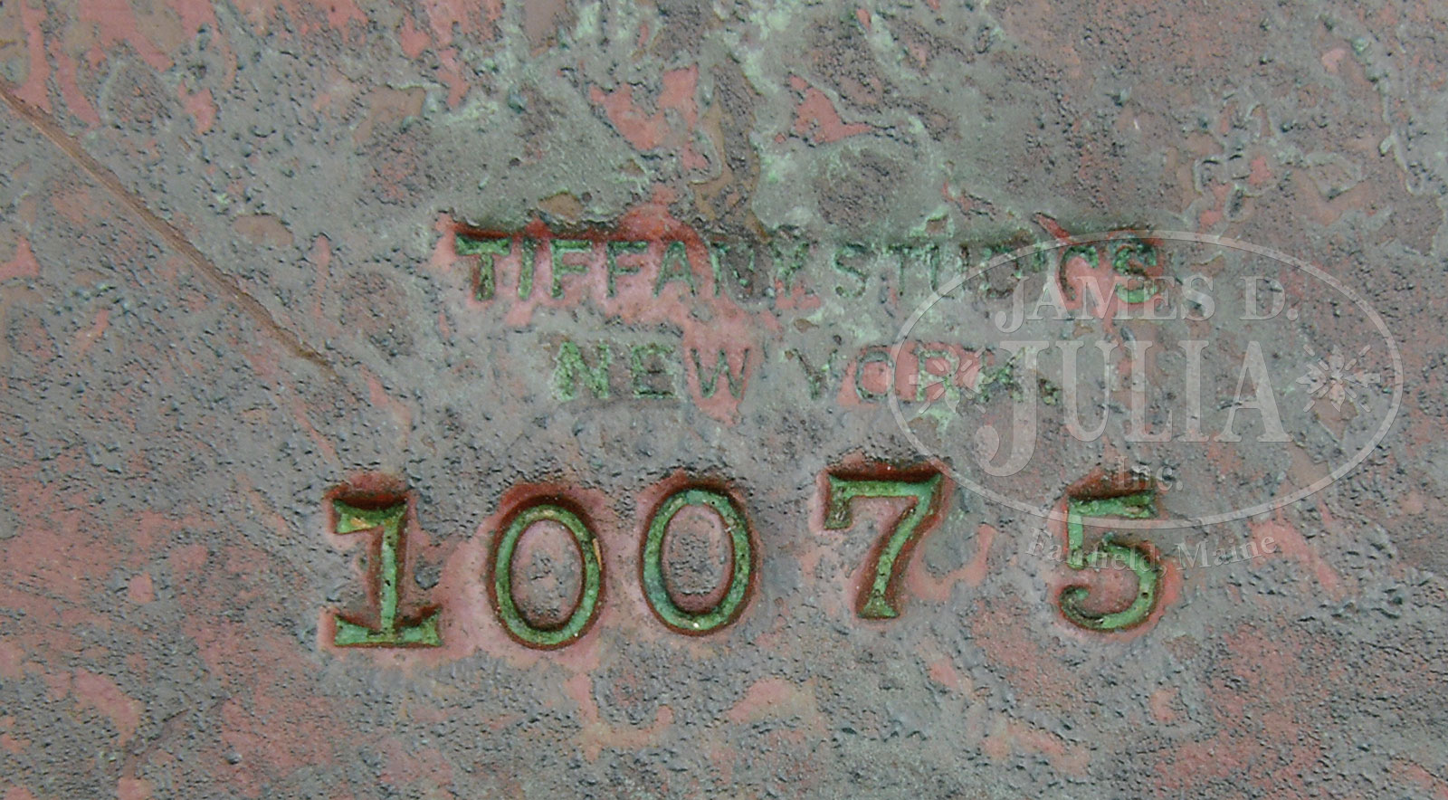 TIFFANY STUDIOS DOUBLE CANDLESTICK.Tiffany Studios candlestick has leaf-shaped tray with attached handle and two reticulated candle cups with blown-out glass inserts. The bronze is finished in a rich brown patina with subtle red and green highlights. Signed on the underside “Tiffany Studios New York 10075”. SIZE: 6-1/4″ t. PROVENANCE: From the Unreserved Estate of Lynda Cunningham. CONDITION: Very good to excellent with some minor wear and discoloration to patina. 51361-31 (1,000-1,500) – Lot 1226