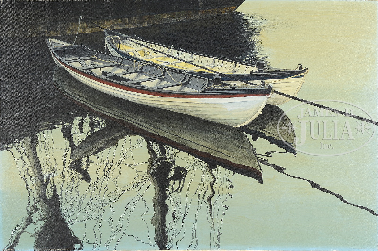 JEFFREY SABOL (American, 20th century) FOUR PAINTINGS.Including: 1) DORIES AT DOCK, oil on board, housed in a painted rustic wood frame, signed and dated lower right “Sabol ’93”; 2) LOBSTER BOAT AT DOCK, oil on board, unframed, signed and dated lower right “Sabol ASMA 00”, dedicated in pencil on reverse “To my good friend Scott, Happy Christmas and a great New Year, 2000, Jeff”; 3) TWO DORIES, oil on canvas, unframed, signed and dated lower left “Sabol ’96”; 4) SWEET PEA, oil on board, unframed, signed and dated lower left “Sabol 95″; SIZE: 1) 30-3/4″ x 24″. 2) 28″ x 8″. 3) 24″ x 36″. 4) 22″ x 28”. Overall size to: 35″ x 29″ CONDITION: 1) Losses and abrasions to red dinghy; 2) minor varnish discoloration, otherwise good. 3) discolored varnish, otherwise good; 4) good condition 49909-2 (1,500-2,000) – Lot 1227