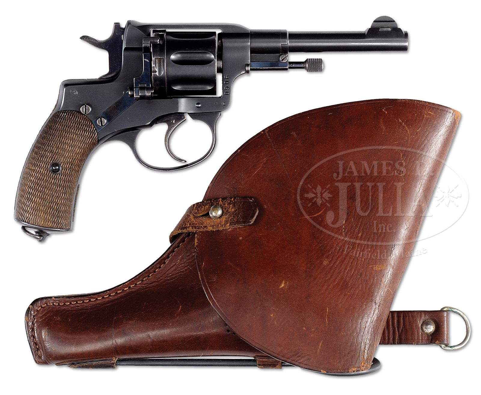 *RADOM NAGANT MODEL 30 REVOLVER WITH HOLSTER.SN 9060. Cal. 7.62 x 25. 4-1/2″ bbl, blue finish, checkered walnut grips. CONDITION: Revolver is in very fine condition, retaining 98% blue on frame, bbl and cylinder and 50% fire blue on hammer, loading gate and trigger. Grips are excellent. Holster is very good and contains an original cleaning rod. Fine rare piece. 49253-6 TEP C&R (2,500-4,500) – Lot 1228