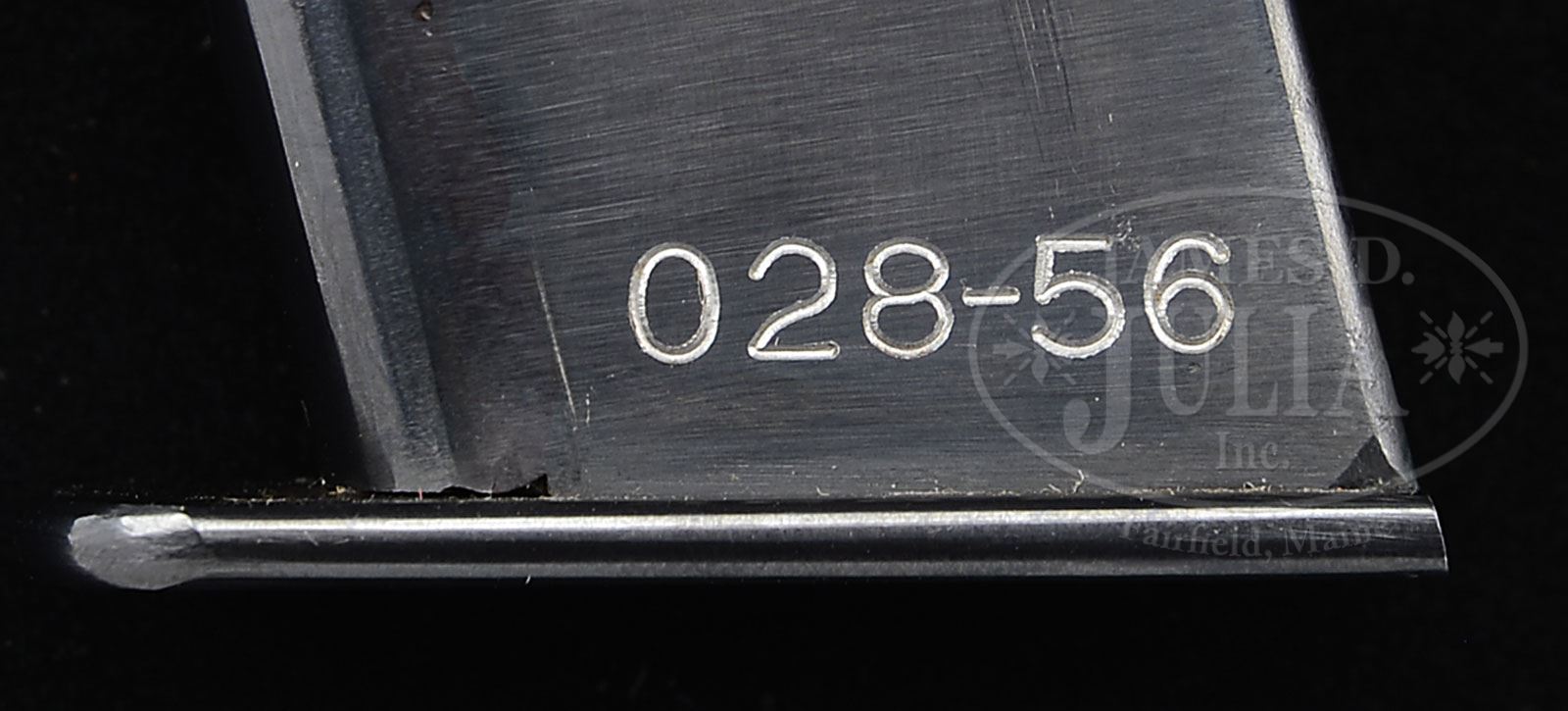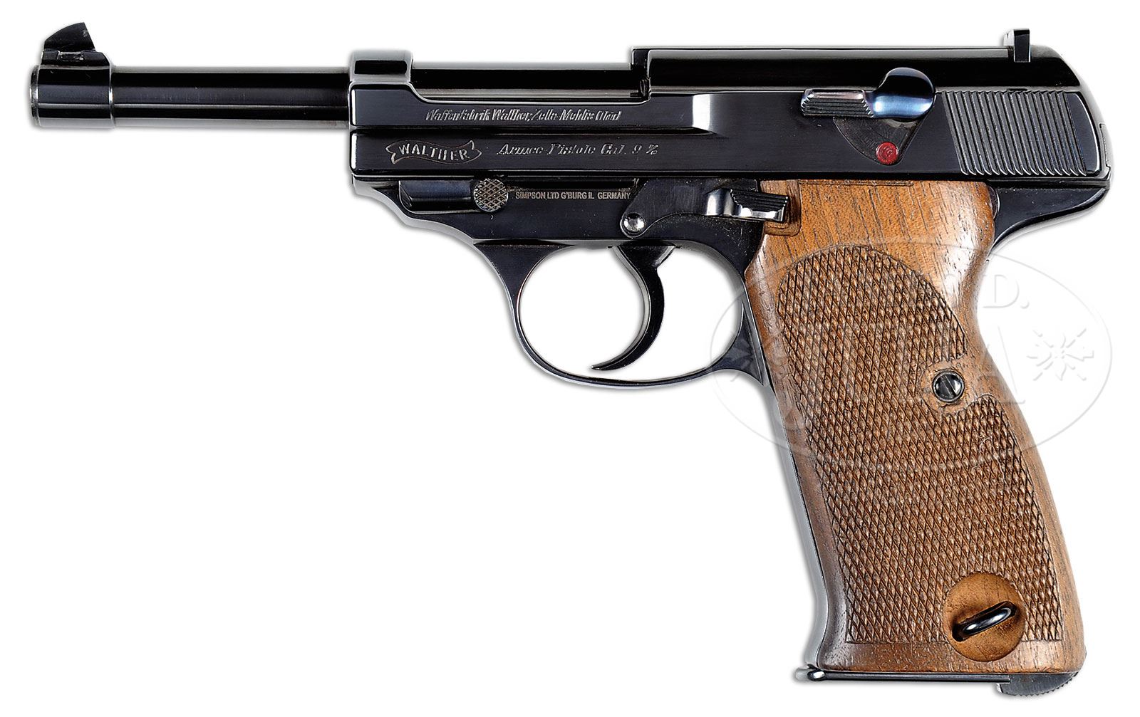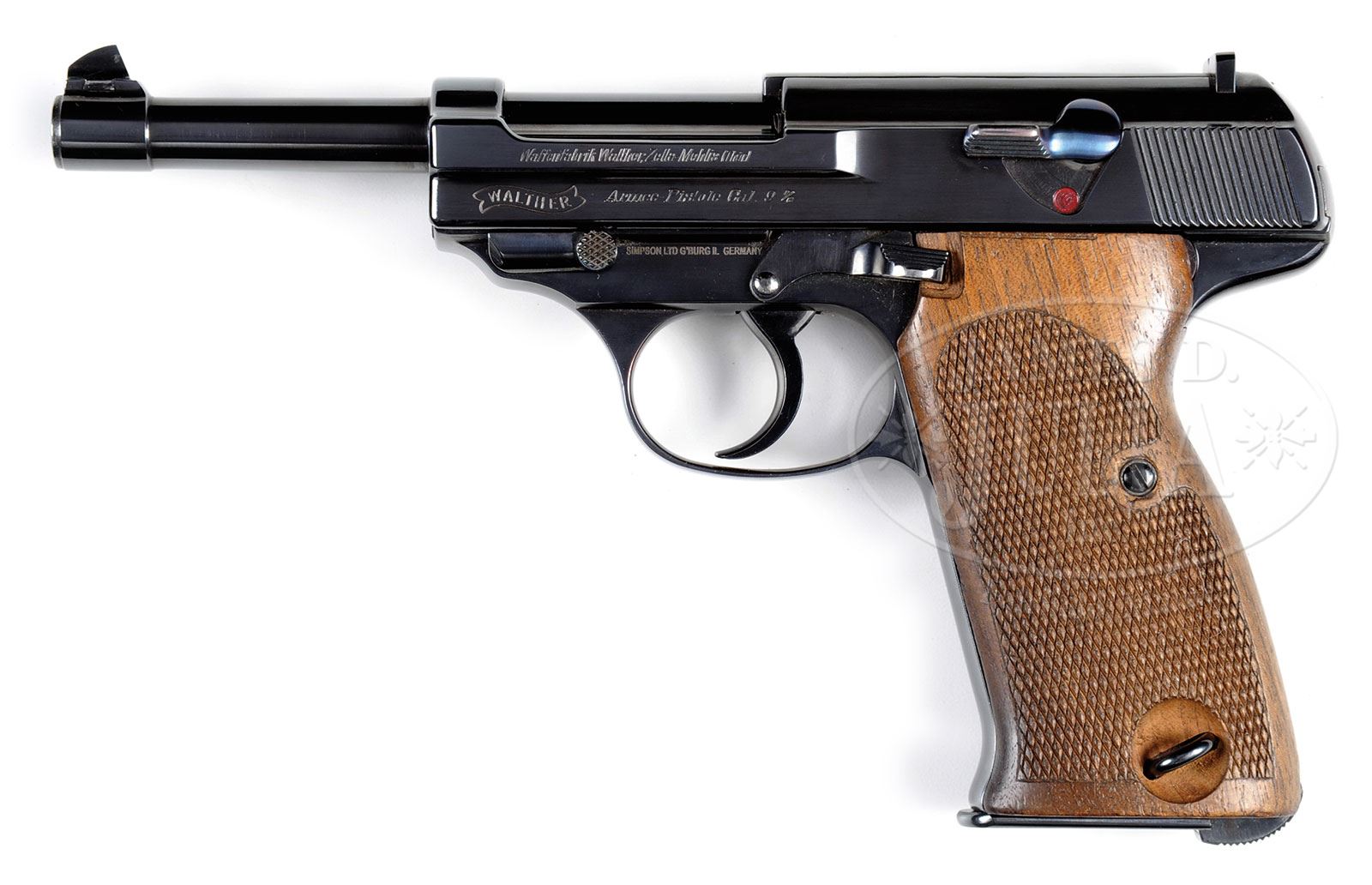 *◊ EXTREMELY RARE WALTHER ARMEEPISTOLE SEMI-AUTO PISTOL.SN 028. Cal. 9 mm. Blue finish with 5″ bbl, dovetailed barleycorn front sight and fixed rear sight on top of slide. Slide has internal extractor. Mounted with 2-pc checkered walnut grips, matching numbered to this pistol. Accompanied by one matching numbered magazine “028-56”. In the mid 30’s the German military began searching for a less expensive military sidearm to replace the venerable P-08 Luger pistol. One of the first prototypes was the Walther Armeepistole about 50 of which pistols were produced in 1936 with every one being slightly different, this being the forerunner of the eventual design competition winner, the P38 pistol. Only a few are known today outside of museum collections and this is one of the finest examples extant. This pistol is pictured on pg 1049 of The Borchardt & Luger Automatic Pistols, Gortz & Sturgess, figure 15-14. Very few of these pistols are currently found in the United States. PROVENANCE: Ex-Kramer Collection; Ex-Abermann Collection; Collection of Dr. Geoffrey Sturgess. CONDITION: Extremely fine plus, all matching. Overall retains about 99% brilliant, high polish blue with crisp clear markings. Grips are crisp, showing only light diamond point wear and a couple of chipped diamonds on the right side. Magazine is equally new with only one small wear spot on the top right and shows having been loaded but not excessively. Mechanics are crisp. Bright shiny bore with very minor, very light frosting in the grooves. 4-53065 (35,000-65,000) – Lot 1229