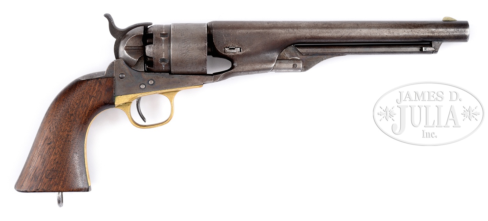 SCARCE MARTIALLY MARKED COLT 1860 ARMY WITH LANYARD RING.SN 98756. Cal. 44. 8″ bbl with German silver front-sight and 1-line US America Address. Frame has “Colts Patent” stamped on left side and 3-screw variation. 6-shot rebated cylinder with Ormsby naval battle scene. Brass front strap and trigger guard, iron back strap, and 1-pc walnut grip. Scarce lanyard ring in grips with factory cutout. Right and left grip with cartouches and left grip stamped “64”. Wedge is mismatched by approx 1,300 numbers. PROVENANCE: The Estate of G. W. “Bill” Stewart of Sonora, Texas. CONDITION: Very good. Bbl is approx 10% blue, mostly in protected areas. Front sight slightly worn. Cylinder scene is approx 70-80% present. Cylinder is mostly brown. Frame retains approx 40% rainbow case color. Grips are sound and retain most of their orig varnish. Cartouches rate good though they have thinned. Mechanics are very good. Bore is good with light staining and pitting. 49973-109 JSL93 (4,500-6,500) – Lot 1229