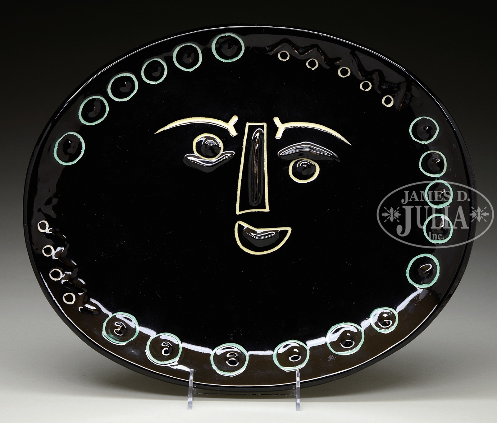 Please Note: Should read: Reverse stamped, marked and numbered “Madoura Plein Feu / Empreinte Orginale De Picasso” and NOT “Madoura Plein Feu / Empreinte Originale De Picasso / I. 115 / Exemplaire Editeur”. PABLO PICASSO (French, 1881-1973) “VISAGE DANS UN OVALE”.An oval black ceramic platter with ring and zig-zag borders centering an abstract smiling face Reverse stamped, marked and numbered ‘Madoura Plein Feu / Empreinte Originale De Picasso / l. 115 / Exemplaire Editeur’ Additionally numbered in marker under glaze ‘I 115 83/100’ NOTE: Conceived on April 8th, 1955 and executed in an edition of 100 Literature: Picasso’s Ceramics, by Georges Ramie, see Ref # item 274 for similar example illustrated on pg 141 SIZE: 15-1/2″ l x 12-3/4″ w CONDITION: Very fine untouched condition 50642-1 (7,000-9,000) – Lot 1231