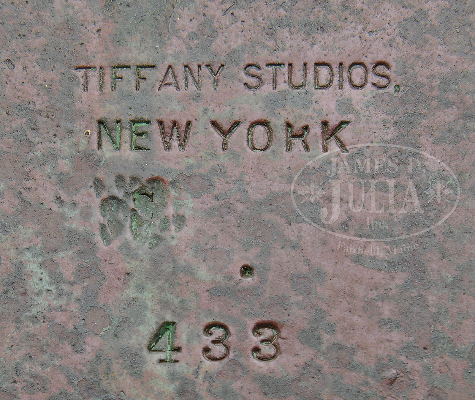 TIFFANY STUDIOS ADJUSTABLE LAMP.Tiffany Studios lamp has bronze adjustable tri-pod base with pad feet resting on a round bronze platform. Bronze is finished in a rich brown patina with subtle green and red highlights. The harp base supports a Tiffany favrile glass shade with green pulled feather design descending from the fitter. Each pulled feather is outlined in gold iridescence, all set against a gold background. Base is signed on the underside “Tiffany Studios New York 433”. Shade is signed in the fitter “L.C.T. Favrile”. SIZE: Shade 7-1/4″ dia. Lamp adjusts from 23-1/2″ to 32-1/2″ t. PROVENANCE: From the Unreserved Estate of Lynda Cunningham. CONDITION: Base is very good to excellent with some minor wear and discoloration to patina. Rewired with appropriate cloth cord. Shade is very good to excellent. 51361-108 (2,000-2,500) – Lot 1232