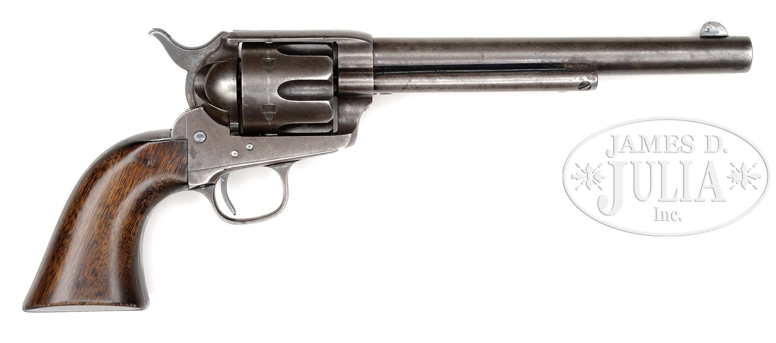 COLT FRONTIER SIX SHOOTER SINGLE ACTION ARMY REVOLVER.SN 80784. Cal. 44 WCF (44-40). Usual configuration with 7-1/2″ bbl, full front sight and 1-line block letter address. Left side of bbl has “COLT FRONTIER SIX SHOOTER” etched panel. Left side of frame has 3-line patent dates and left front web of trigger guard is marked “44 C.F.”. Bottom of bbl is marked with a tiny “44”. Mounted with 1-pc walnut grip that has last four digits of matching serial number in backstrap channel. Bottom of bbl & cyl also have last four digits of matching serial number. This revolver was produced in about 1882 at the height of the Great Westward Expansion when the west was wild and the Indian wars were still being fought. Firearms of that era were daily use tools, usually under harsh circumstances with little to no maintenance. PROVENANCE: Tommy Rholes Estate Collection. CONDITION: Very good, all matching. Etched panel on bbl is weak, but mostly legible. Overall retains traces of orig finish in the most sheltered areas, generally being a plummy brown patina with thin spots on the bbl; cyl is matching patina; grip is sound, showing moderate edge wear and retains most of an old refinish; screws are fine and retain strong fire blue; base pin is orig type with dimpled ends. Mechanics are fine; bright shiny bore with a few scattered spots of light pitting. 4-50781 JR424 (4,000-7,000) – Lot 1233