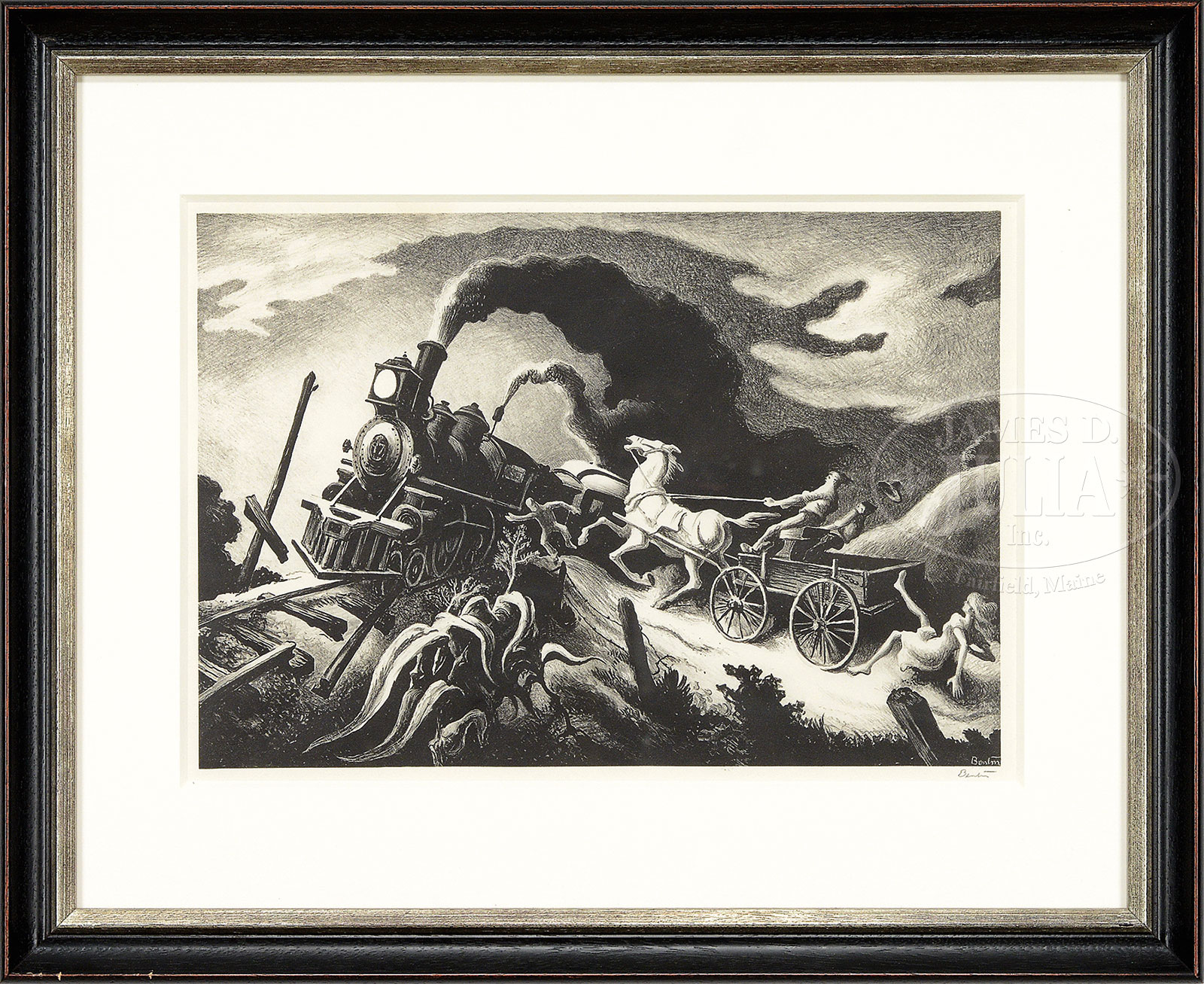 THOMAS HART BENTON (American, 1889-1975) “WRECK OF THE OLD 97”.Lithograph, 1944 (Fath 63) Housed in a contemporary black frame, matted under plexiglass Signed in pencil lower right “Benton”, titled on Surovek Print Gallery label affixed to verso SIZE: 10-1/4″ x 14-3/4″. Overall: 18-1/4″ x 22-1/4″. CONDITION: Very good to excellent, not examined out of frame. 52102-16 (17,000-20,000) – Lot 1233