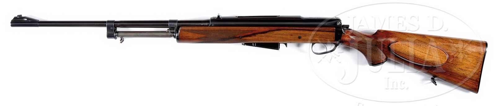 *EXTREMELY RARE HOLEK AUTOMAT SPORTING RIFLE.SN 286. Cal, 7 x 57. 20.5″ bbl.Interesting tipping breech block (similar to ZB vz. 26/BREN MG) semi-automatic sporter developed by the Czech arms designer Emmanuel Holek (brother of Vaclan Holek) and manufactured in 1942, utilizing an under-barrel tapped gas recoil system, the weapon cocks by taking the front sling loop and pulling the gas system rearward thus disengaging and retracting the tipping bolt. This rifle was very advanced for its time, it is Czech proofed and is marked with Holek’s logo and “ORIGINAL HOLEK AUTOMAT” on the top receiver rear. Fixed rear sight and ramp front. Multi-point checkered European walnut stock with cheekpiece and sling swivels. Original detachable magazine. CONDITION: Excellent. Wood and metal retain virtually all of their fine factory finish with only a few very small handling marks on the stock. 49296-7 WD1 C&R (2,500-3,500) – Lot 1234
