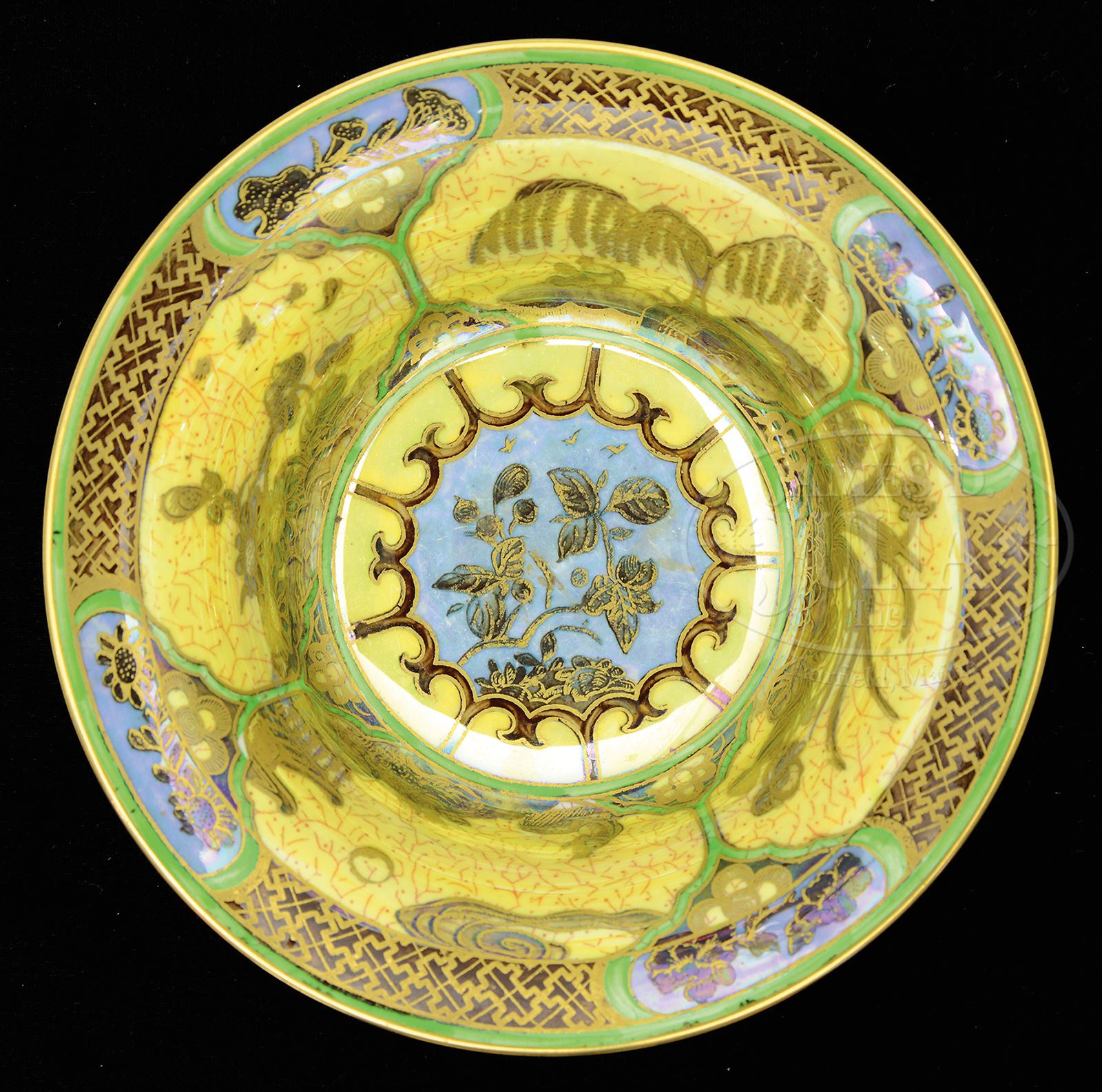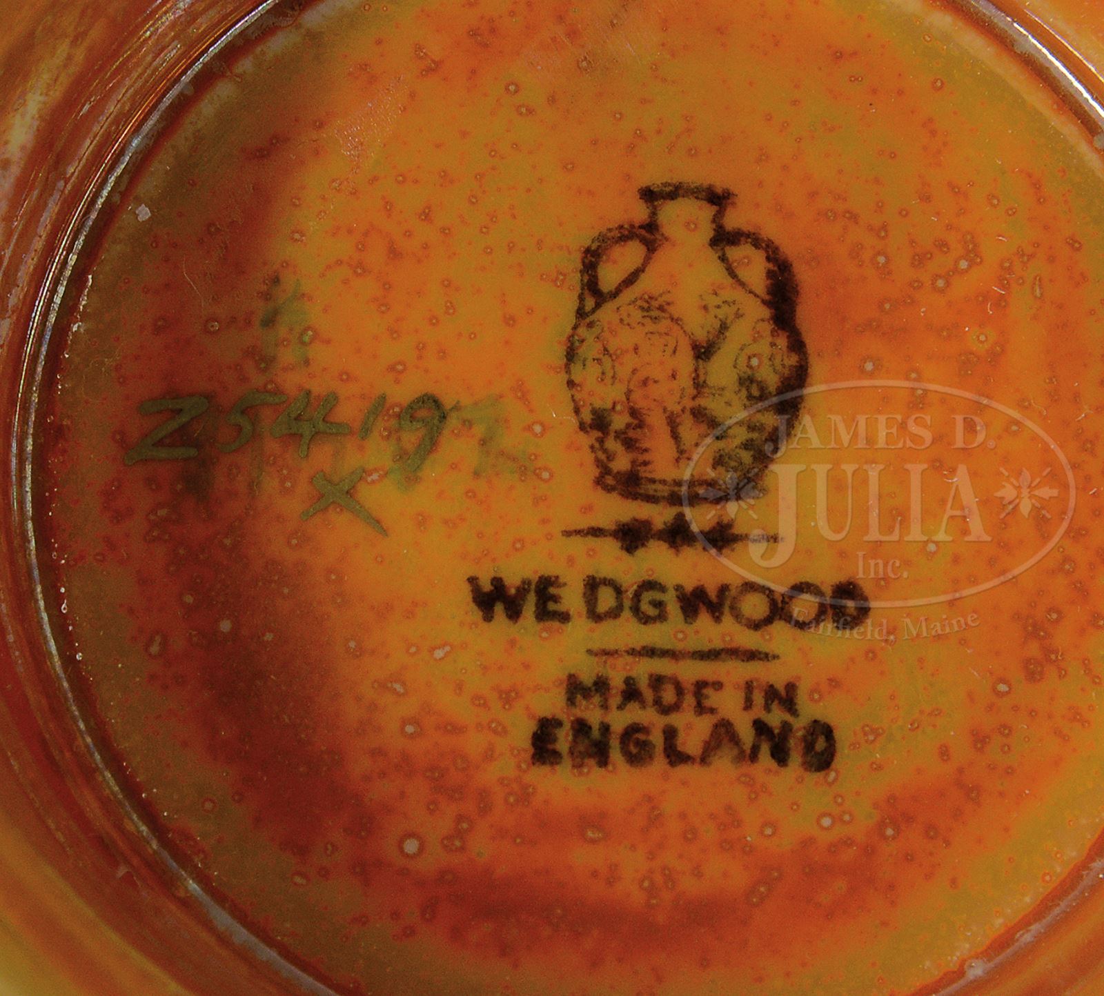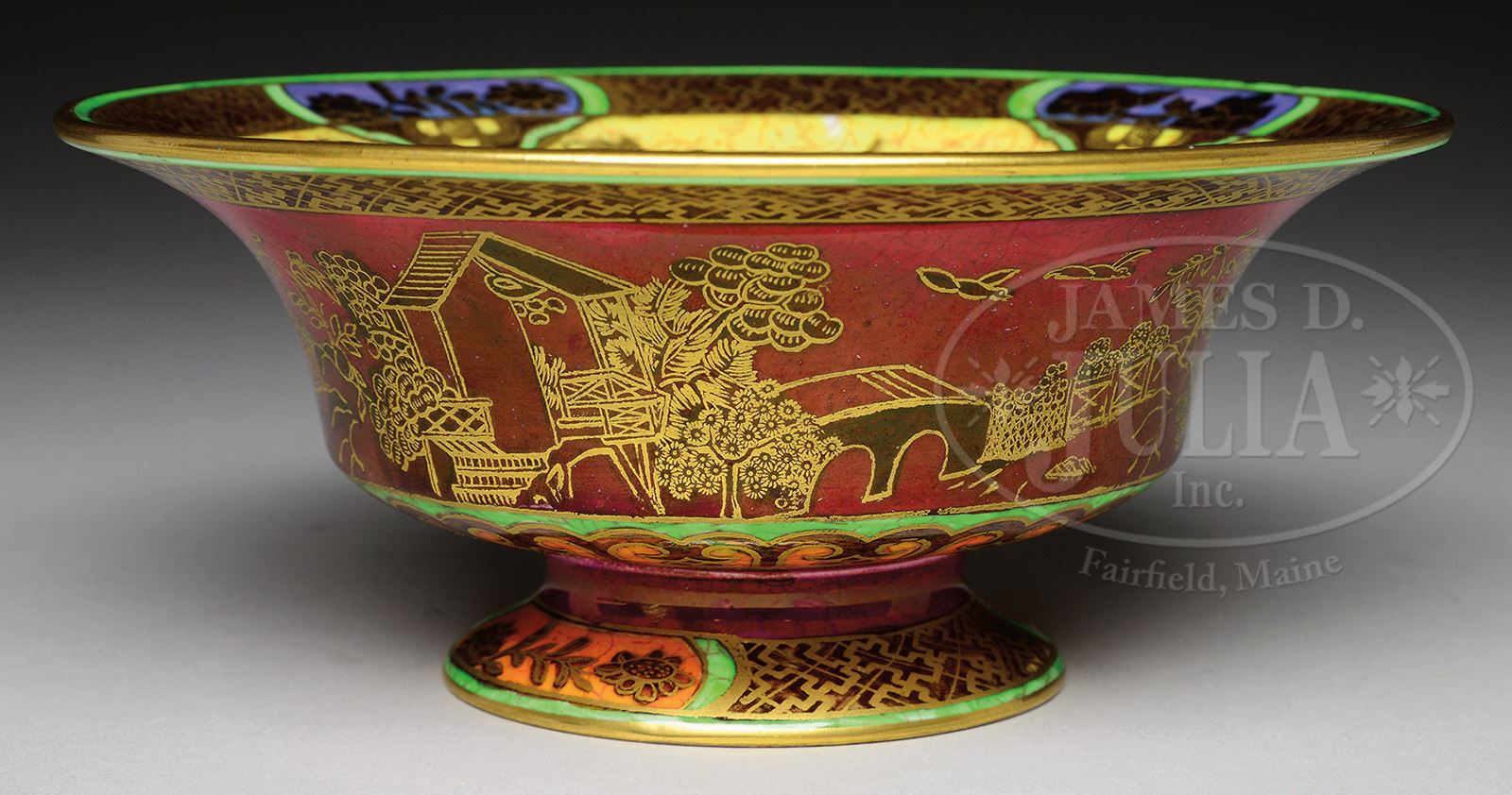 WEDGWOOD FAIRYLAND LUSTRE DAVENTRY BOWL.Wedgwood Fairyland Lustre Daventry bowl is decorated on exterior with enameled and gilded Oriental village surrounding side against rich red background. Interior is decorated with four panels with gilded flowers and trees within three panels and gilded pagoda in fourth. Signed on underside with Portland vase mark “Wedgwood Made In England” and “Z5419”. SIZE: 6-5/8″ dia. CONDITION: Very good to excellent with some minor wear to gilding on bottom interior of bowl. 50395-3 (1,000-1,500) – Lot 1234