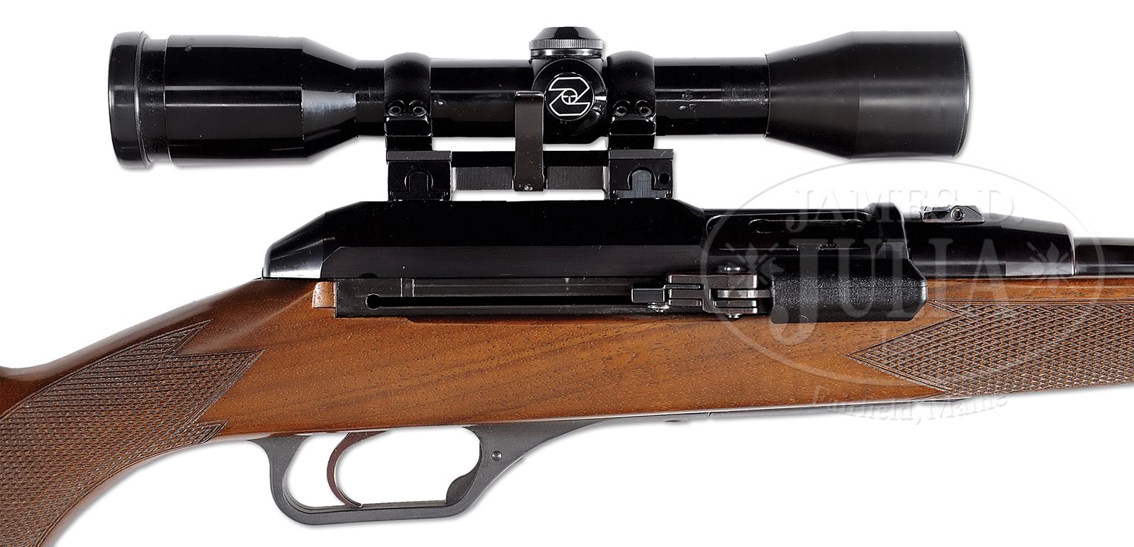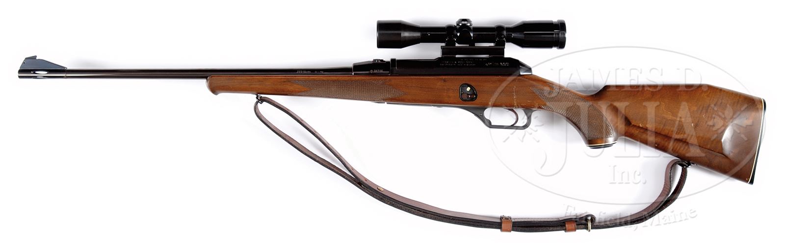 *HK MODEL 630 SEMI-AUTOMATIC SPORTING RIFLE.SN 04106. Cal .223 20″ barrel with factory muzzle brake and folding leaf rear sight. Polished blue-finish semi-auto receiver with fold down charging handle. Checkered walnut stocks with cheekpiece and sling swivels. Mounted with Zeiss Diatal-C 4x scope in HK scope mount. Factory five round magazine. Leather adjustable sling. CONDITION: Excellent. Retains virtually all of its fine factory finish with some light scrapes and handling marks on the stock. Mechanics crisp. Optics clear. 49183-23 WD2 (1,200-2,200) – Lot 1235