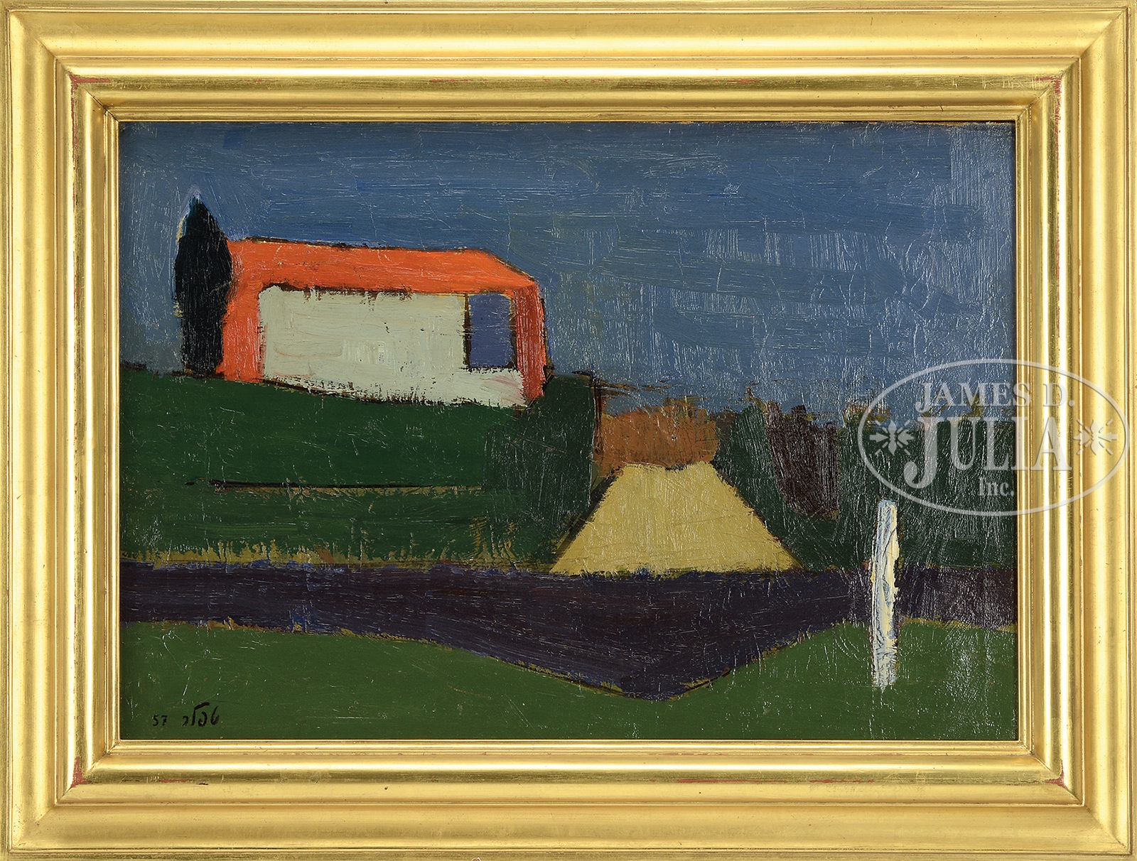 SCHOOL OF MILTON AVERY (American,1885-1965) RED BARN.oil on canvas Housed in a contemporary gilt molded wood frame Signed with an indecipherable monogram lower left and dated “57” Back retaining a Kulicke Frames Inc. New York label SIZE: 15″ x 21-1/2″. Overall: 20-1/2″ x 27″ CONDITION: Some light touch up, very good 50806-6 (8,000-12,000) – Lot 1235