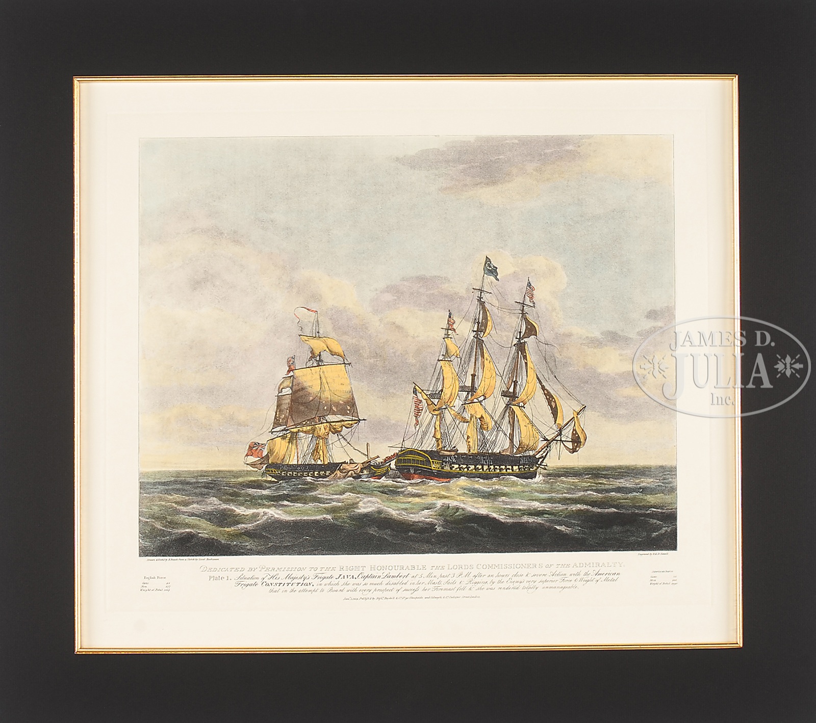 AFTER NICHOLAS POCOCK (British, 1740-1821) FOUR COLORED SHIP ENGRAVINGS.All engraved by R & D Havell Plate 1 – 4 showing the battle between the frigate Java and frigate Constitution All housed in black mats with gold edge SIZE: Sight: 19″ x 22″. Overall: 25″ x 18″ CONDITION: Very good 49745-13 (1,500-2,000) – Lot 1237