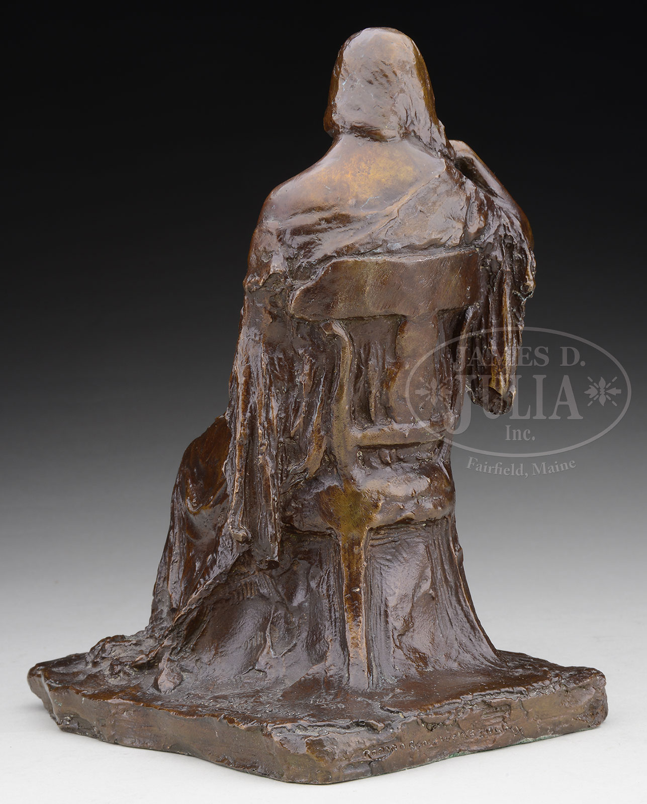 BESSIE ONAHOTEMA POTTER VONNOH (American, 1872-1955) SEATED YOUNG WOMAN.Bronze Signed “Bessie Potter Vonnoh 18/250” Inscribed along edge “Roman Bronze Works N-Y-” SIZE: 8-1/4″ h x 6-1/2″ d x 5″ w CONDITION: Very good with a nice, dark brown patina 52351-1 (4,000-6,000) – Lot 1238