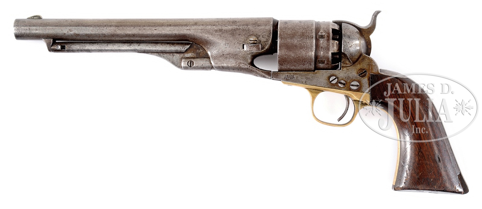 CIVIL WAR MODEL 1860 COLT ARMY REVOLVER.SN 32635/15193. Cal. 44. Original example of Civil War Colt model 1860 Army which was the most popular cavalry side arm of the Civil War. This example made early in 1862 with 4-screw frame cut for shoulder stock still retains inspectors cartouche on left grip and appears complete, original and authentic. PROVENANCE: The Brad Shepherd Collection. CONDITION: Good to very good overall, all matching SNs with exception of cyl which is numbered 15193 but has matching color and condition, not uncommon for U.S. martials to have interchanged parts in the field. SN 32635 is found on bbl, frame, trigger guard, backstrap and last 4 digits are found on wedge and inside grip channel. Markings are all discernible though bbl address is weak. Grips are well fit with hand worn patina, cartouche is visible in outline only on left side which also has large chip at rear toe. Cyl retains 10-20% of its rolled cyl scene. Mechanically gun functions well with crisp rifling in bore. 50062-72 JS (1,000-1,500) – Lot 1239