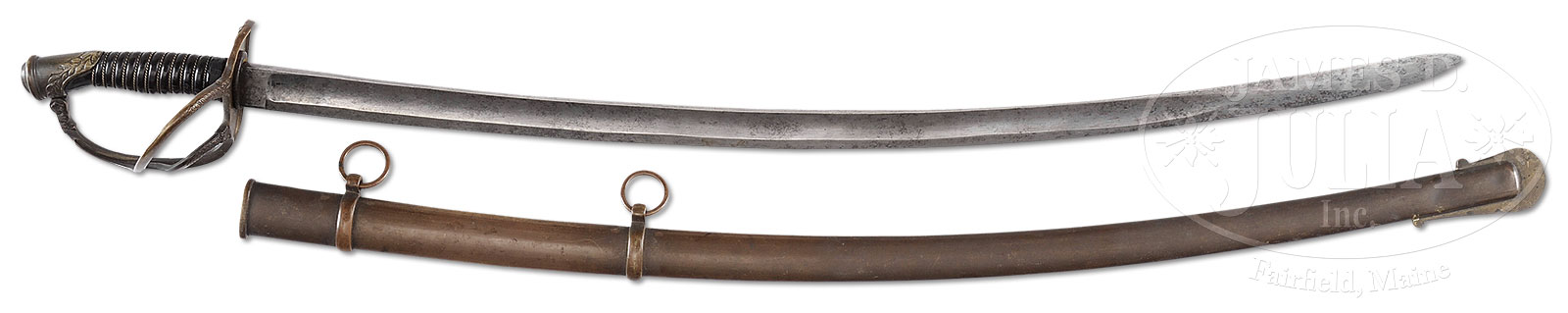 EXTREMELY FINE THOMAS, GRISWOLD CAVALRY OFFICER’S SABER.You are bidding on one of the most popular of Confederate swords among collectors and the finest example we have encountered. These swords were so popular in their day that several Confederate Generals carried them and even one Union General was known to have carried one that he must have captured at some campaign during the war. Though New Orleans fell early in the war, they produced some of the best made swords in the Confederate service. This cavalry officer’s, as many of their products, had their signature solid brass scabbard. Blade is full firm marked “Thomas, Griswold & Co., New Orleans”. This example is no doubt as fine an example that you will find. CONDITION: 34-1/2″ blade is overall gray with scattered light staining. Makers mark is crisp as seen in photos. Blade is still quite sharp, and appears contemporary sharpened to time of use. Grip retains 95% of its original leather with polish, scuffing and chipping, there is about 1/2″ chip of wood at base of grip unaffecting aesthetics as wood there has dark patina. Twisted brass wire wrap is tight and complete. Brass hilt and scabbard have fine matching dark mustard colored patinas. Scabbard body has 2 light dents. 50412-54 JS (15,000-25,000) – Lot 1239