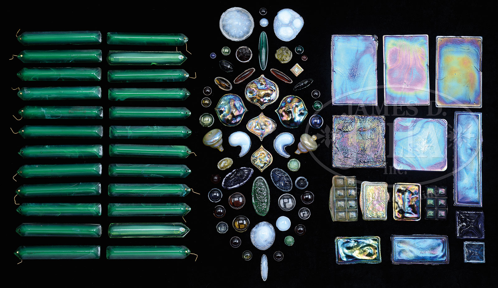 MISCELLANEOUS GLASS PRISMS, CABOCHONS AND TILES.Lot consists of 25 Austrian green glass prisms; 22 are matching emerald green color, 2 are light green and 1 is an opaque mint green. 7 small pressed turtleback tiles, 32 colored glass cabochons, 8 colored glass chunk jewels, 4 miscellaneous pressed glass tiles, 5 opalescent jewels and 7 blue iridescent glass tiles. SIZE: Prisms: 6″ l. PROVENANCE: From the Unreserved Estate of Lynda Cunningham. CONDITION: 1 light green prism has a chip to the side, 3 emerald green prisms each have a chip to the side, otherwise very good to excellent. Jewels have some roughness to edges from the making. 51361-122 (1,000-1,500) – Lot 1240