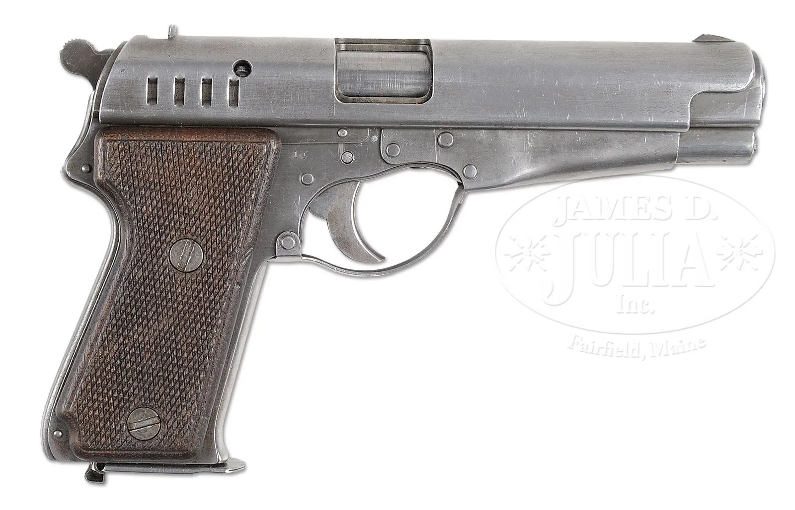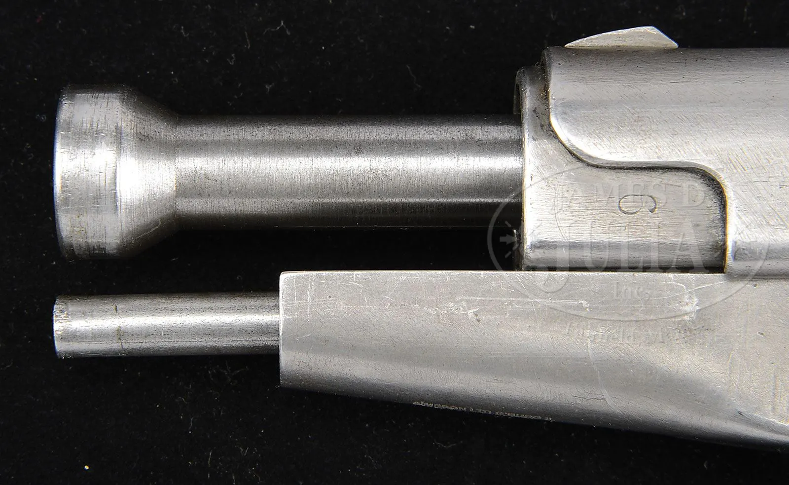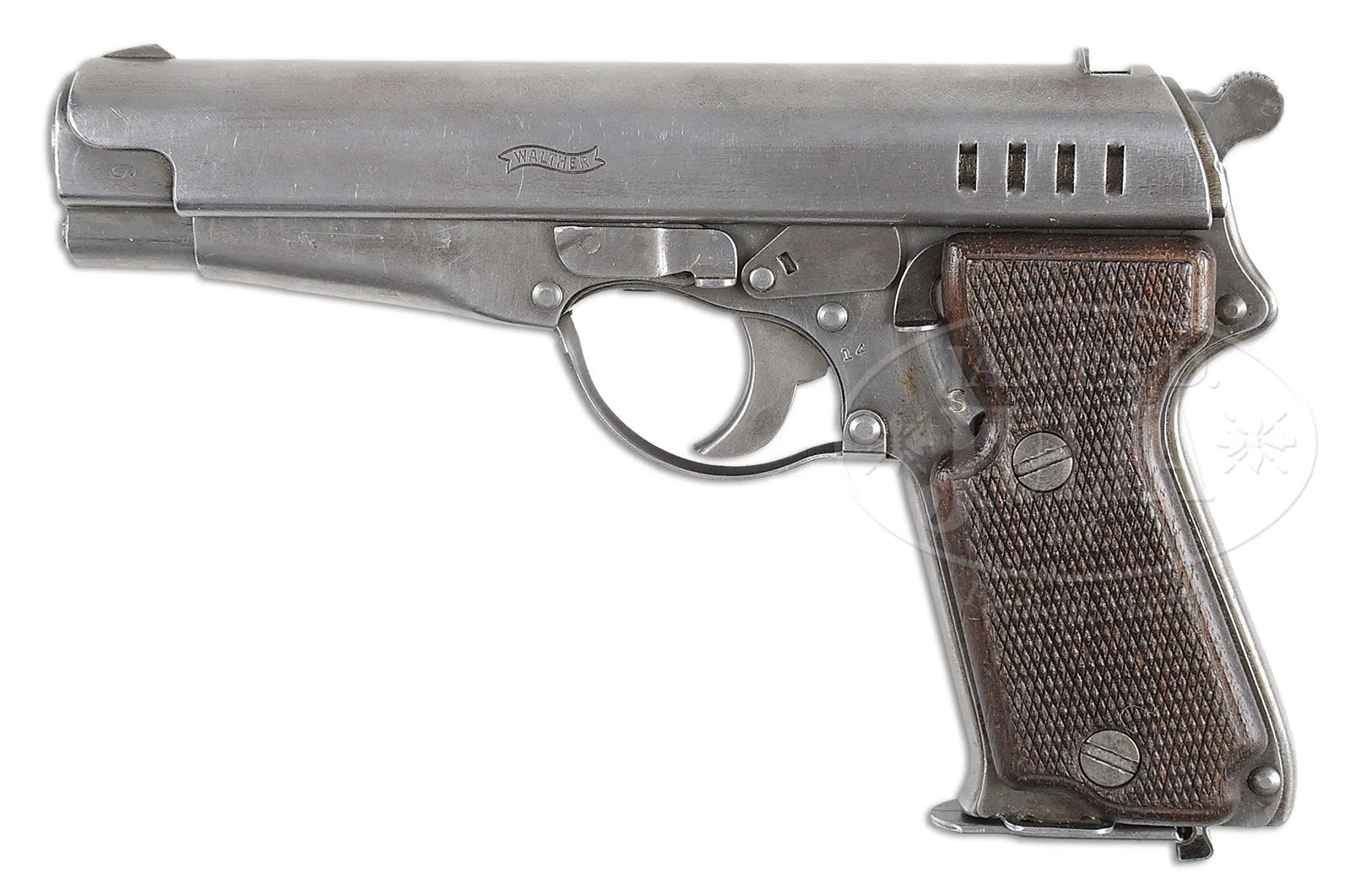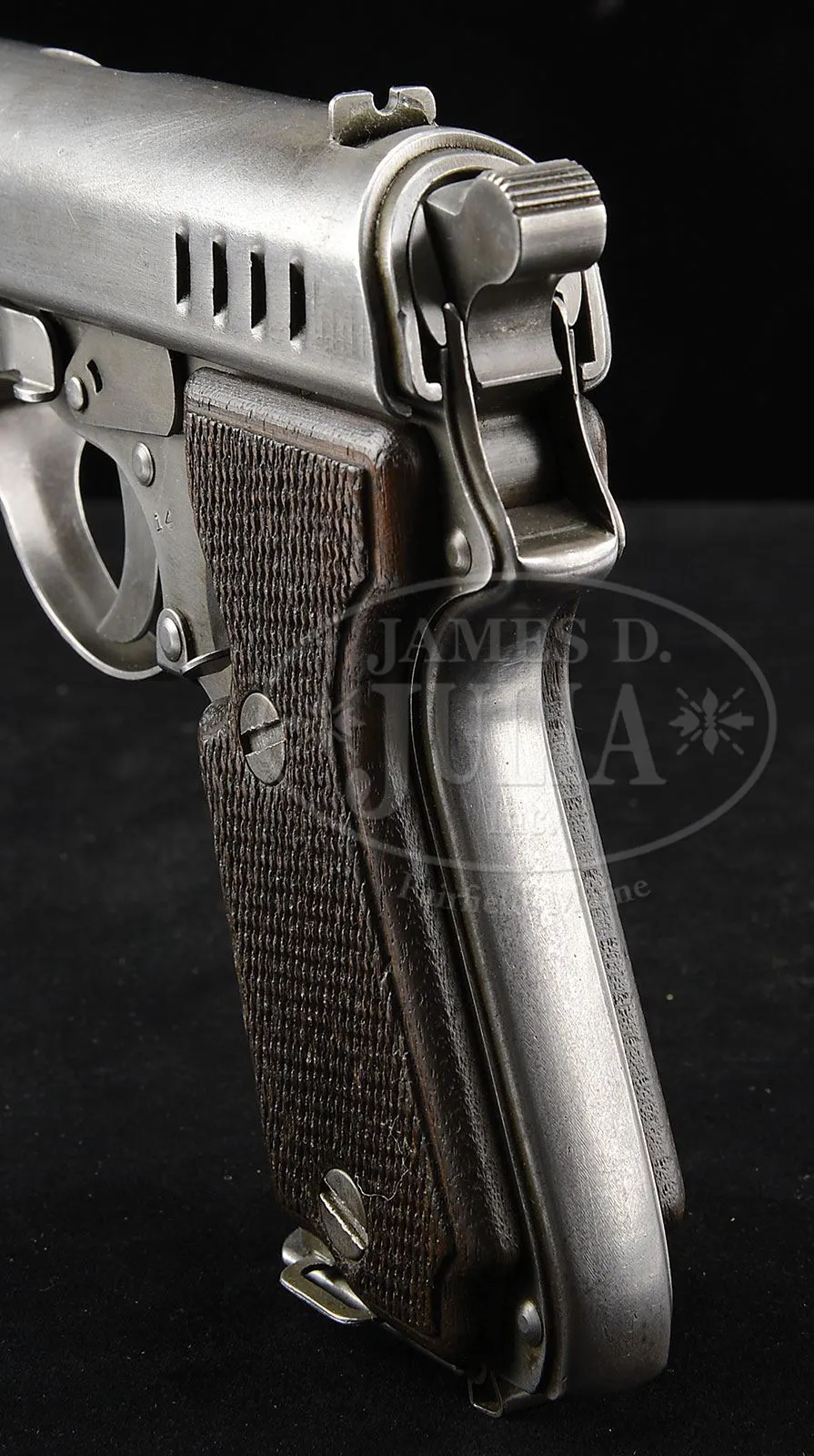 *◊ WALTHER VOLKSPISTOLE, ALL SHEET METAL SINGLE ACTION PROTOTYPE, 9MM PARABELLUM.SN 6. Cal. 9mm Parabellum. Exceedingly rare Walther sheet metal prototype, in-the-white, simple blowback action, single action only, with unique bbl having a flared muzzle. This example has a 5″ bbl with a fixed front sight & an integral rear sight attached to a folded sheet metal slide. The left side of the slide is marked with the Walther banner and the usual slide serrations have been replaced with four punched indentations on each side which also serve to locate the machined from solid breech block. The pressed construction grip frame is spuriously marked “14” on each side, just behind the trigger guard cutout. Mounted on the left side is a takedown lever and a flat slide holdopen. The stamped safety is in the recess cut into the left upper grip with detents marked “F” & “S”. At the base of the left frame is a lanyard loop. A standard P38 magazine, marked “P38 VU” on the left side & having an unnumbered base, is retained via a folded bottom release with a smooth surface. Wood grips are coarsely checkered & bordered, each retained by two large screws. The slide is marked with a “6” (or “9”) on the left side and SN “4” is electro-pencilled internally under the barrel retaining recess; This is the final flowering of Walther’s expertise in sheet steel construction and design, produced in 1945 as a last ditch weapon using the simplest materials and production techniques, it competed with Mauser’s comparable design in trials by the Waffenamt in early 1945, but was far too late for production during the war, and only this and one other example are now known to exist. Illustrated in Weaver’s “Desperate Measures”, page 313. PROVENANCE: Ex-Visser collection; Collection of Dr. Geoffrey Sturgess. CONDITION: Uniformly toned colourless Parkerizing now appearing as being in-the-white with scattered staining & trace oxidation. The same condition applies to all small parts & grip screws. Checkered wood panels are in excellent condition with staining & a few superficial handling dings, consistent with and complimenting the appearance of the pistol. Same holds true for the slightly discolored in-the-white P38 magazine. Near mirror bore. Perfect manual mechanics. The ultimate Walther collector’s piece, never before offered at public auction and a true once in a generation opportunity. 4-53062 LMA107 (65,000-95,000) – Lot 1241