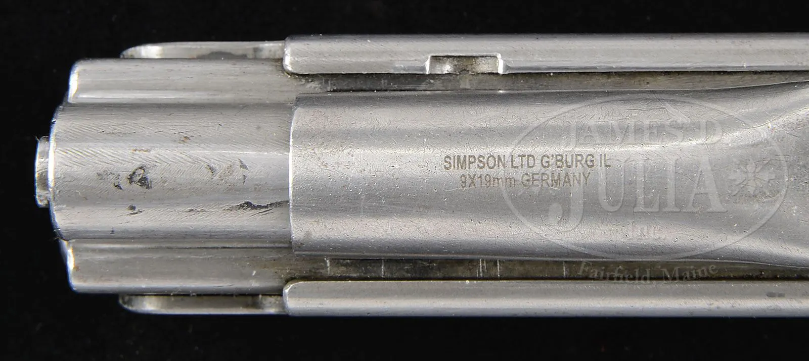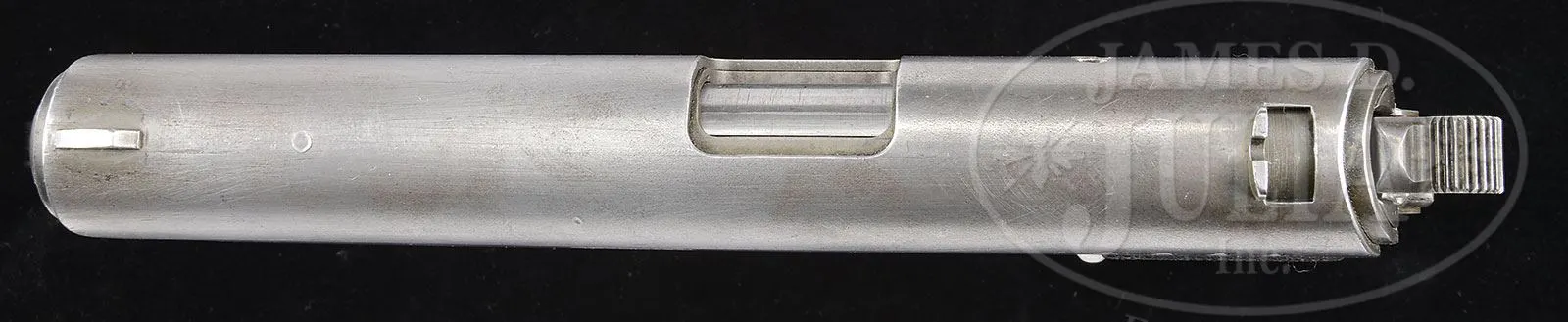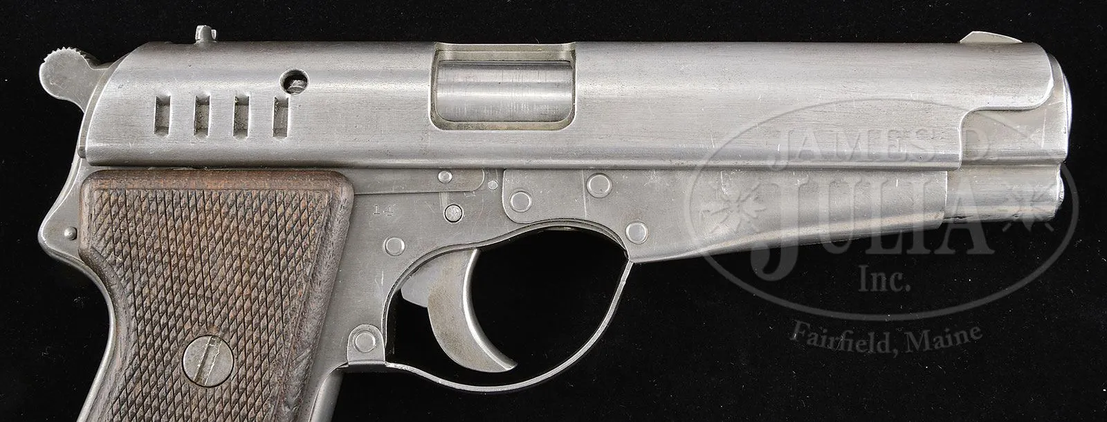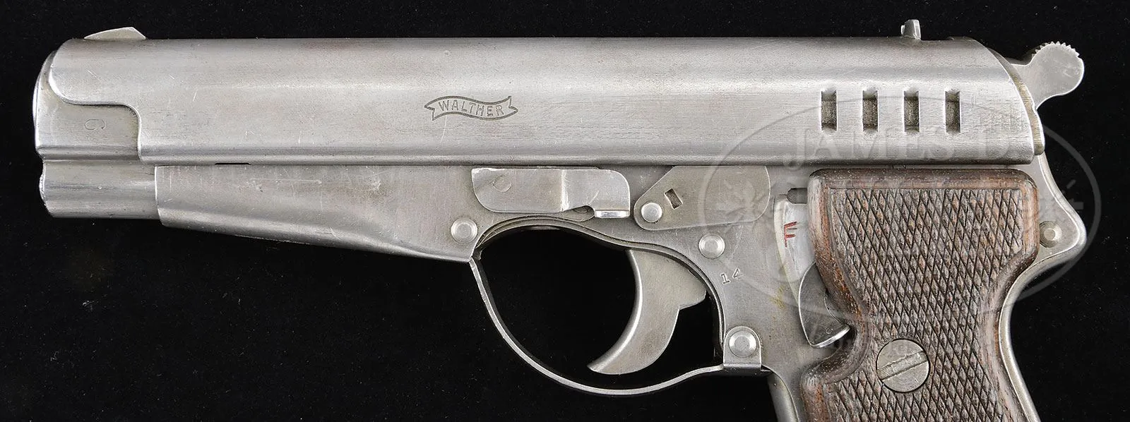 *◊ WALTHER VOLKSPISTOLE, ALL SHEET METAL SINGLE ACTION PROTOTYPE, 9MM PARABELLUM.SN 6. Cal. 9mm Parabellum. Exceedingly rare Walther sheet metal prototype, in-the-white, simple blowback action, single action only, with unique bbl having a flared muzzle. This example has a 5″ bbl with a fixed front sight & an integral rear sight attached to a folded sheet metal slide. The left side of the slide is marked with the Walther banner and the usual slide serrations have been replaced with four punched indentations on each side which also serve to locate the machined from solid breech block. The pressed construction grip frame is spuriously marked “14” on each side, just behind the trigger guard cutout. Mounted on the left side is a takedown lever and a flat slide holdopen. The stamped safety is in the recess cut into the left upper grip with detents marked “F” & “S”. At the base of the left frame is a lanyard loop. A standard P38 magazine, marked “P38 VU” on the left side & having an unnumbered base, is retained via a folded bottom release with a smooth surface. Wood grips are coarsely checkered & bordered, each retained by two large screws. The slide is marked with a “6” (or “9”) on the left side and SN “4” is electro-pencilled internally under the barrel retaining recess; This is the final flowering of Walther’s expertise in sheet steel construction and design, produced in 1945 as a last ditch weapon using the simplest materials and production techniques, it competed with Mauser’s comparable design in trials by the Waffenamt in early 1945, but was far too late for production during the war, and only this and one other example are now known to exist. Illustrated in Weaver’s “Desperate Measures”, page 313. PROVENANCE: Ex-Visser collection; Collection of Dr. Geoffrey Sturgess. CONDITION: Uniformly toned colourless Parkerizing now appearing as being in-the-white with scattered staining & trace oxidation. The same condition applies to all small parts & grip screws. Checkered wood panels are in excellent condition with staining & a few superficial handling dings, consistent with and complimenting the appearance of the pistol. Same holds true for the slightly discolored in-the-white P38 magazine. Near mirror bore. Perfect manual mechanics. The ultimate Walther collector’s piece, never before offered at public auction and a true once in a generation opportunity. 4-53062 LMA107 (65,000-95,000) – Lot 1241