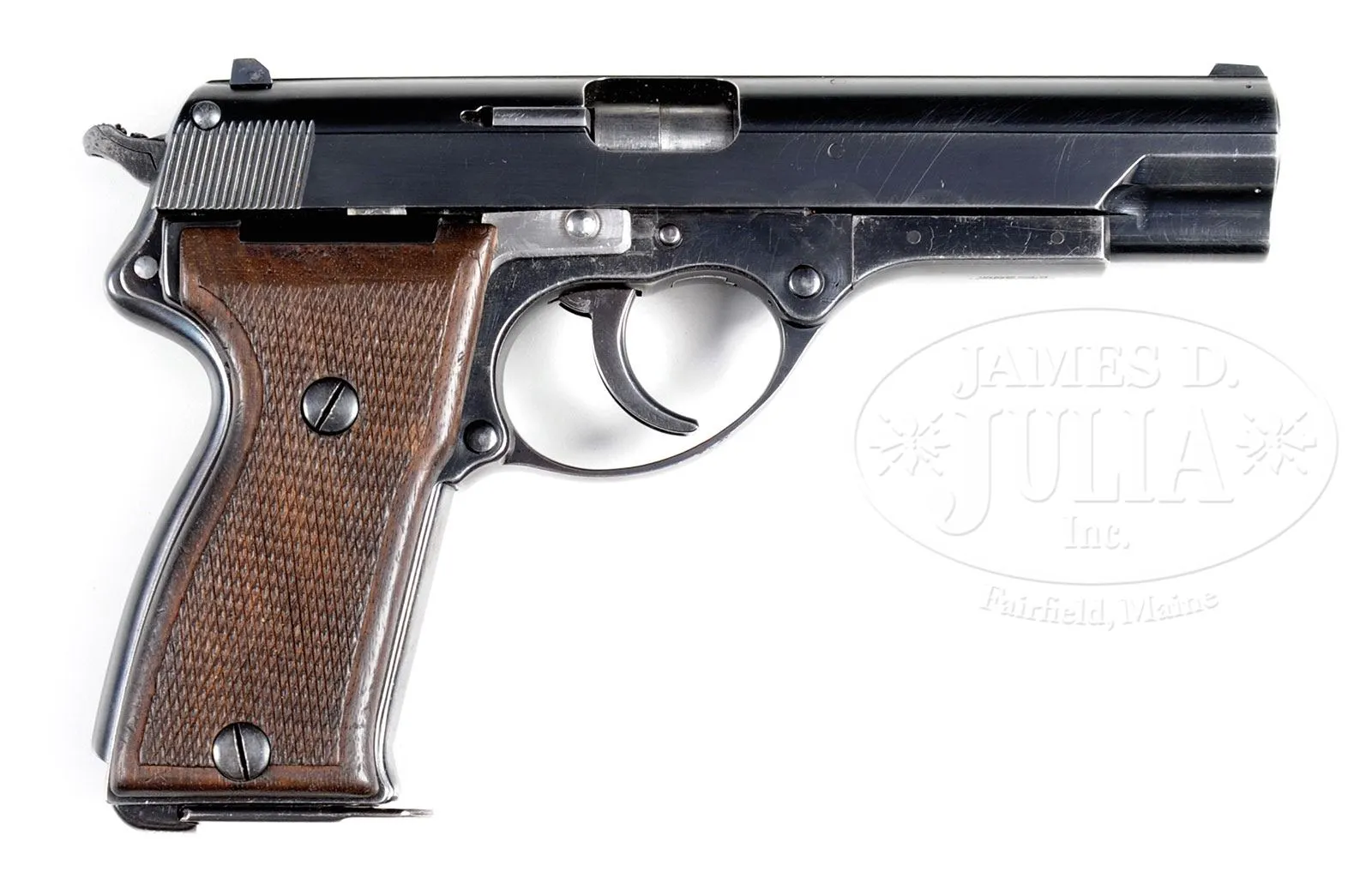 SN 4B. Cal. 9mm Parabellum. Exceedingly rare Walther sheet metal prototype, blued finish, double action only, with rotary locked large diameter bbl. This example has a 4-3/4″ bbl with a fixed front sight & drift adjustable rear sight attached to a machined slide with riveted bbl control cams. The left side of the slide is marked with the Walther banner. No safety catch on slide. The all pressed sheet steel construction grip frame is marked “4B” for purpose of importation. Mounted on the left side is a pressed takedown lever and a flat slide holdopen. The safety is in the recess cut into the left upper grip. At the base of the left frame is a lanyard loop. A standard P38 magazine is retained via a bottom release. Wood grips are coarsely checkered & bordered, each retained by two screws. A precursor of the all pressed steel construction Walther Volkspistole, this example from ca. 1943 exhibits exceptional mastery of sheet steel pressing design and execution in the grip frame, which is of all pressed construction, combined with a machined slide and turning barrel locking action reminiscent of the Steyr M1912 or Nickl/CZ pistols. Illustrated in Weaver’s “Desperate Measures”, page 308. PROVENANCE: Collection of Dr. Geoffrey Sturgess. Illustrated TBLAP. CONDITION: Approx 90% orig salt blue with age appropriate staining & fading, particularly on the front & rear grip straps. Excellent orig grips with only a few handling dings. No checkering losses, splits or chips. Bright near mirror bore. Trigger rebound spring is sluggish, requiring that the trigger be nudged forward into full position. Safety function unreliable. One of Walther’s most desirable wartime prototype pistols, often regarded as the Holy Grail for advanced collectors. 4-53060 LMA106 (50,000-75,000) – Lot 1242