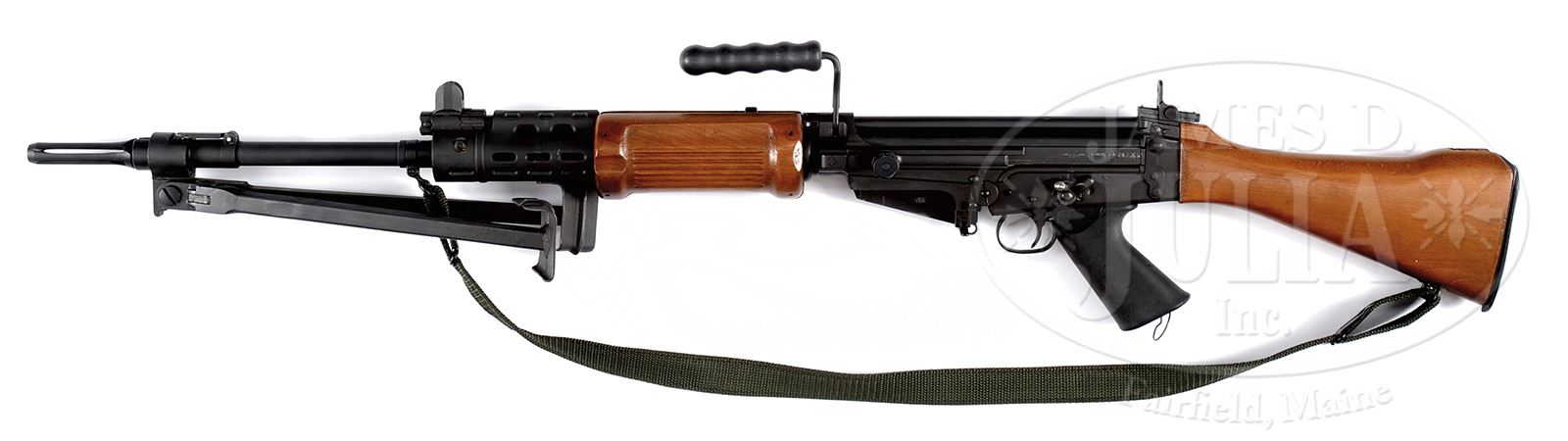 *ISRAELI MFG FN-FAL HEAVY BARREL SEMI-AUTO RIFLE WITH FLASH HIDER, BIPOD, AND SLING.SN 87045. Cal. 7.62 mm, 25″ bbl, Marked with Israeli Star of David and Hebrew markings on right side of receiver, as well as importation maker “ONYX ARMS GTF MT”. Left side of rcvr marked “7.62 mm S.A. FAL”. Lower handgrip assy has three position safety with dished out markings and marked “S” and “S” next to the two forward positions. Top quality steel reinforced wooden forend, flip-up buttplate, orig bipod, and sling included. No magazine present. CONDITION: Near excellent orig matte blued finish with virtually no finish loss to metal or wood parts. Slight handling marks only, with some slight brassing to the pin which holds the bipod on the barrel. Bore is near excellent, shiny and bright. Flash hider absolutely clean. Pretty much impossible to upgrade from this specimen of an outstanding shooting platform. 49544-1 JWK1 (1,500-2,500) – Lot 1242
