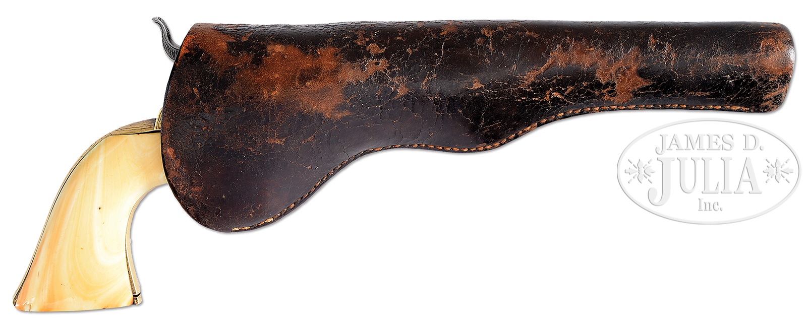 FACTORY ENGRAVED COLT MODEL 1861 PERCUSSION NAVY REVOLVER WITH IVORY GRIPS AND “SLIM JIM” HOLSTER.SN 11814. Cal. 36. Model 1861 Colt Navy percussion revolver in standard configuration with 7-1/2″ bbl made in 1863, gun exhibits fine engraved floral and punch dot designs in frame and bbl housing, hammer engraved with animal head. Matching SNs are found with initials “IE”, which probably denotes Ivory and engraved. Gun is accompanied by fine “Slim Jim” holster. PROVENANCE: The Estate of W. G. “Bill” Stewart of Sonora, Texas. Special Note: This item contains or is made of ivory. Do not bid on this lot unless you have read and agreed to our "Ivory Position Statement" and the "Waiver of Legal and Financial Risk to James D. Julia in regards to your Purchase of an Ivory Object." This information is located in the front section of our catalog. CONDITION: Gun is good to very good overall, all matching including wedge. Gun has been cleaned, gray overall with pitting, backstrap and trigger guard have tiny traces of silver with overall smooth light mustard patina, markings are mostly discernible though portions of address are weak as can be seen in photos. SN are all discernible and Colt’s patent with last 4 digits of SN present on cylinder. Cylinder scene is about 20% visible. Grips are no doubt original Colt grips but are poorly fit to this gun with discernible gaps at top of backstrap as can be seen in photos. Mechanically gun functions well, with well defined rifling and bore. Grips are “Certifiable Antique Elephant Ivory”. Holster is very good and sound overall with scuffing and crazing in high areas, sewn belt loop is sound with similar scuffing and crazing, holster was made without plug, about 1″ of sewing is loose at top edge. 49973-441, 49973-295, JS IVORY (3,000-5,000) – Lot 1242