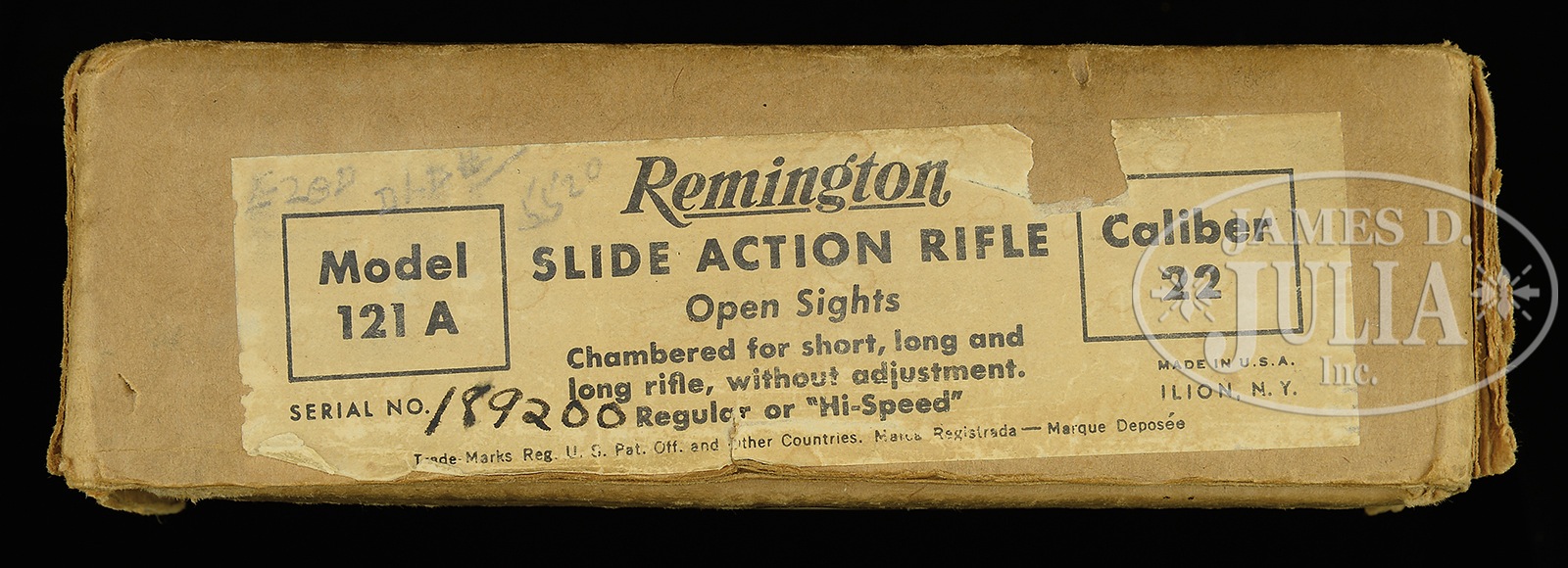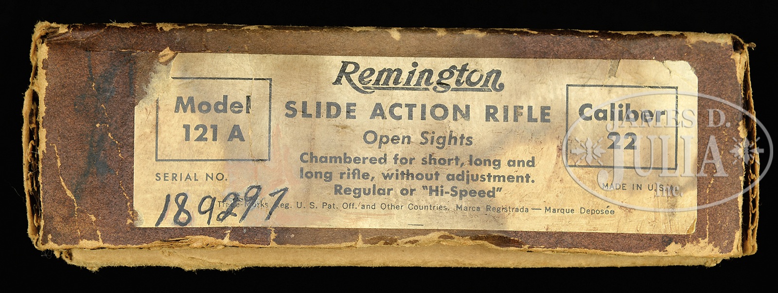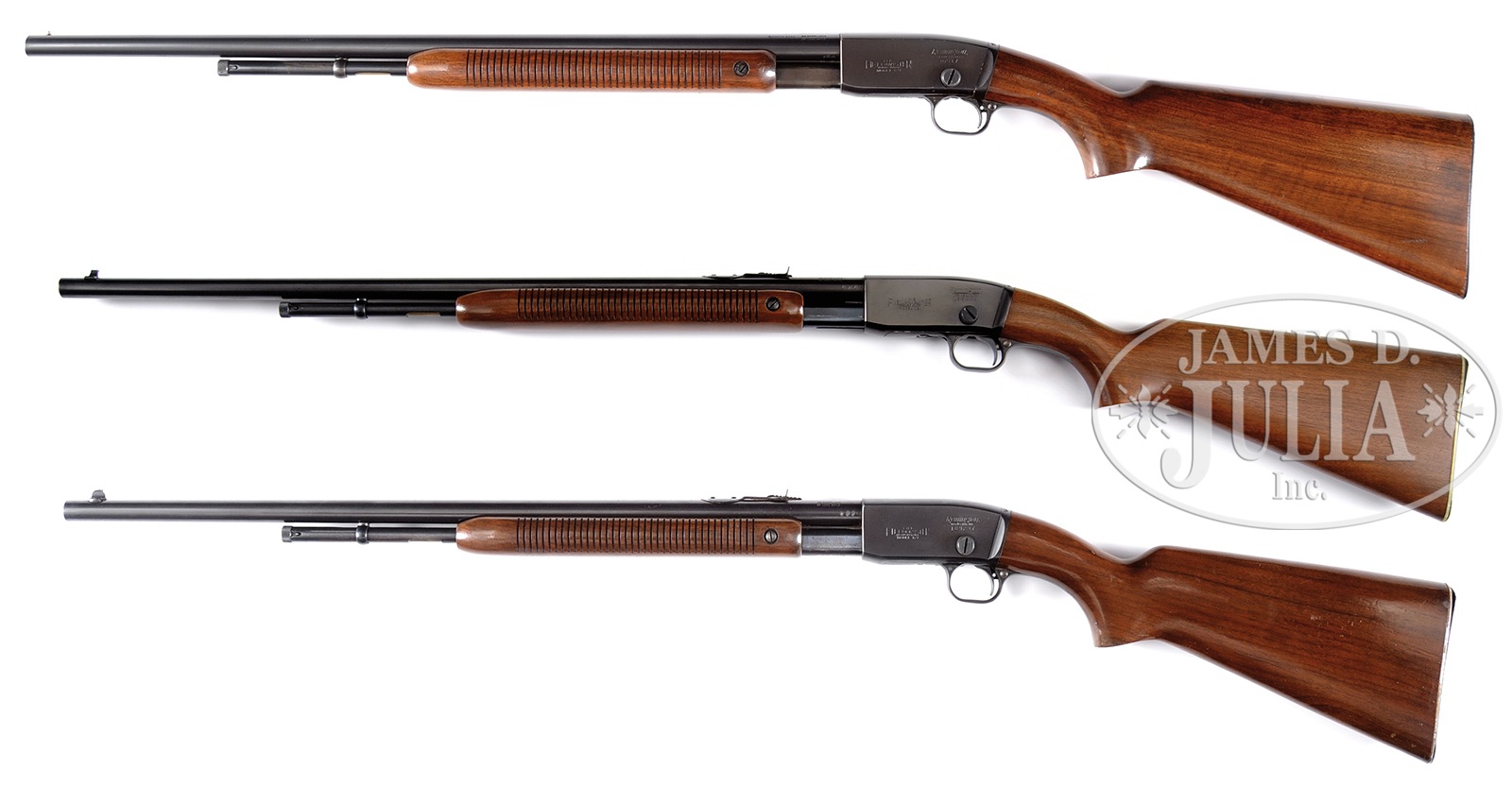 *LOT OF THREE REMINGTON MODEL 121 SLIDE ACTION RIFLES INCLUDING ONE ROUTLEDGE BORE.1) REMINGTON 121SB. SN 30517. Cal. 22. 24″ SMOOTH BORE bbl, marked “SMOOTH BORE” ahead of caliber marking. Single bead front sight. Takedown style receiver. Uncapped pistol grip. Steel buttplate with Remington logo. CONDITION: Fine. Bbl and magazine tube retain nearly all of the strong factory blue, slight wear at muzzle, scattered marks. Wear on mag and action bar from cycling. Receiver nearly all factory blue with wear to high edges, slight markings. Forend and buttstock orig finish with light scattered handling marks. Good mechanics. Shiny bright bore. C&R 2) REMINGTON 121A. SN 189200. Cal. 22 LR. 24″ rnd bbl, standard sights. Takedown receiver. Uncapped pistol grip, serrated Remington buttplate. Accompanied by original box with end label identified with this SN. CONDITION: Very fine. This gun retains virtually all of its factory finishes and appears unused. Box is tight and sound. C&R 3) REMINGTON 121A. SN 189297. Cal. 22 LR. 24″ rnd bbl, orig sights. Takedown receiver. Uncapped pistol grip, serrated Remington buttplate. Accompanied by original factory box with end label identified by SN. CONDITION: Bbl and magazine tube retain nearly all factory blue with very slight oxidation on forward part of right side of bbl. Slight slide wear. Receiver with nearly all blue with slight wear to sharp edges and some thinning on top and bottom of receiver. Factory wood finish with light scattered handling marks. Slight finish loss on buttplate. Good mechanics. Bright bore. Box is sound and tight. C&R 50426-1, 50426-23, 50426-30 TJW (3,750-5,750) – Lot 1242