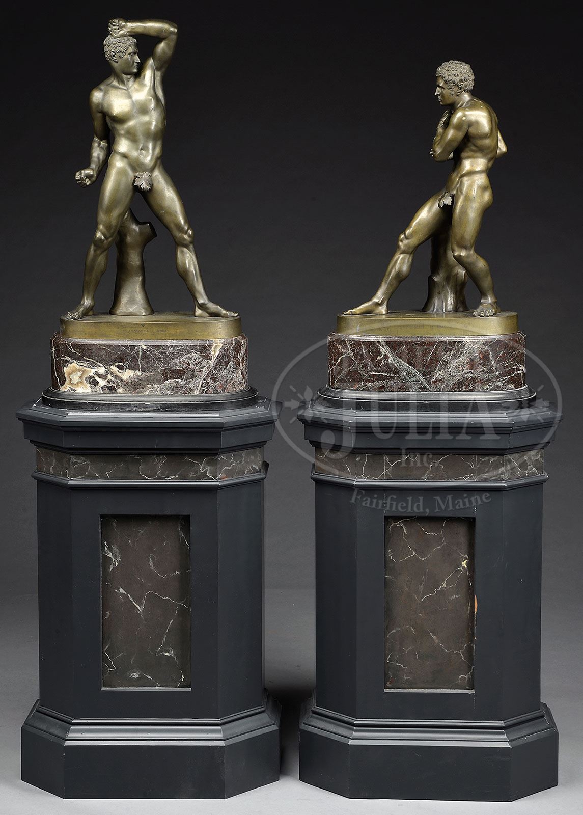 PIETRO CHIAPPARELLI (19th/20th century) PAIR OF CLASSICAL PUGILIST FIGURES. Bronze Accompanying each bronze is a marble oval base. These sit atop a faux marble tall painted wood stand. Signed on side of bronze “Po. Chiapparelli Fe. Roma”. NOTE: Accompanying this grouping are two bronze fig leaves to accommodate Victorian tastes. SIZE: Statues: 24″h and 28″h. Marble Plinth: 6″h. Pedestal: 35″h. CONDITION: Very good. Fine patina. Wooden statuary bases with more recent finish. 9-92488 (7,500-15,000)