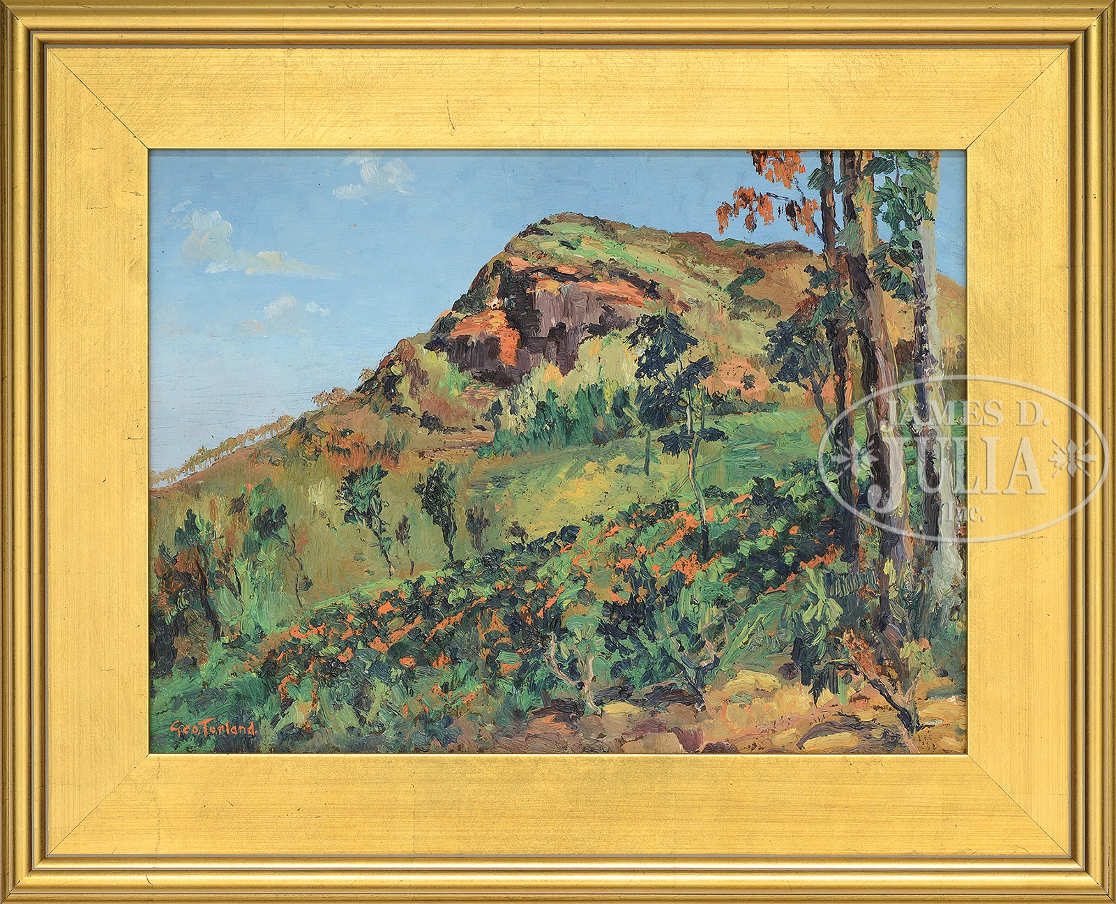 GEORGE TURLAND GOOSEY (British/American, 1877–1947) “CEYLON”, 1935.Oil on canvas laid down on Masonite Housed in a contemporary giltwood frame Signed lower left “Geo.Turland.”, inscribed on verso “Ceylon 1935 on back” SIZE: 12″ x 16″. Overall: 17-1/4″ x 21-1/4″ PROVENANCE: From the Estate of George Turland CONDITION: Very good. 49902-1 (800-1,200) – Lot 1244