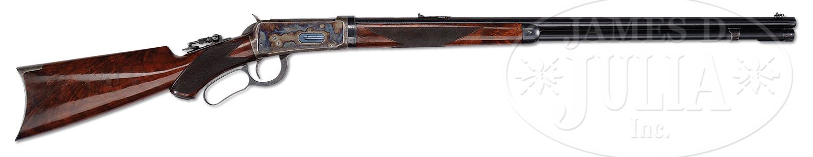 Please Note: Certifiable antique ivory bead sight. Special Note: This item contains or is made of ivory. Do not bid on this lot unless you have read and agreed to our “Ivory Position Statement” and the “Waiver of Legal and Financial Risk to James D. Julia in regards to your Purchase of an Ivory Object“. This information is located in our catalog on pages 30 and 31. EXTREMELY RARE SPECIAL ORDER DELUXE COLOR CASE HARDENED WINCHESTER MODEL 1894 TAKEDOWN LEVER ACTION RIFLE.SN 16464. Cal. 30 WCF (30-30). Beautiful deluxe rifle with 26″ rnd bbl, full magazine, takedown, Beach’s style combination front sight, platinum line 3-leaf express rear sight and a Lyman tang sight. Bbl has full matted top with address rolled through the matting and caliber marking to the left side. Mounted with spectacular 3X, center crotch, flame grain American walnut with “H” style checkered forearm and capped pistol grip stock that has crescent buttplate. Left side of lower tan, under the wood, is marked with the assembly number “3354”, “XX”, “S”, “R” and “P”. Top tang channel of buttstock has assembly number “2484” which number is also on rear face of buttstock along with “94”. Inside toe of buttplate has the number “2484”. This rifle was produced in 1896 and, undoubtedly was a special order with its color case hardened receiver. A Cody Firearms Museum letter has been ordered that will list this rifle in caliber 30 with rnd bbl, plain trigger, Lyman combination front sight and Lyman combination rear sight with cup disc, color case hardened with matted bbl and checkered pistol grip stock received in warehouse Dec. 14, 1896 and shipped next day to Order #24371. Very few ’94 rifles were ordered with this feature which makes them very rare. Almost certainly there are many other color cae hardened rifles out there but the colors have faded to gray and are no longer recognizable as case colored receivers. Simple excessive handling of the receiver will fade the case colors but more importantly, exposure to the ultraviolet rays of sunlight also fades colors very quickly. Very few of these rifles are found today with orig factory finish. CONDITION: Very fine. Bbl & magazine tube retain 96-97% strong orig blue with a few scattered spots of light surface discoloration; bbl extension has a few small dings and retains about 80% bright orig blue; receiver retains brilliant case colors on the sides, lightly faded over the top and turning gray on the bottom; both sides show light surface etching; lever & hammer retain bright case colors, faded on outer faces of lever; buttplate retains strong, bright case colors. Forearm has a series of bruises at the front & rear left side, otherwise wood is sound with a few light nicks & scratches and retains about all of its orig piano varnish finish. Mechanics are fine, bright shiny bore. 4-55549 JR349 (25,000-40,000) – Lot 1246 Click here to view provenance