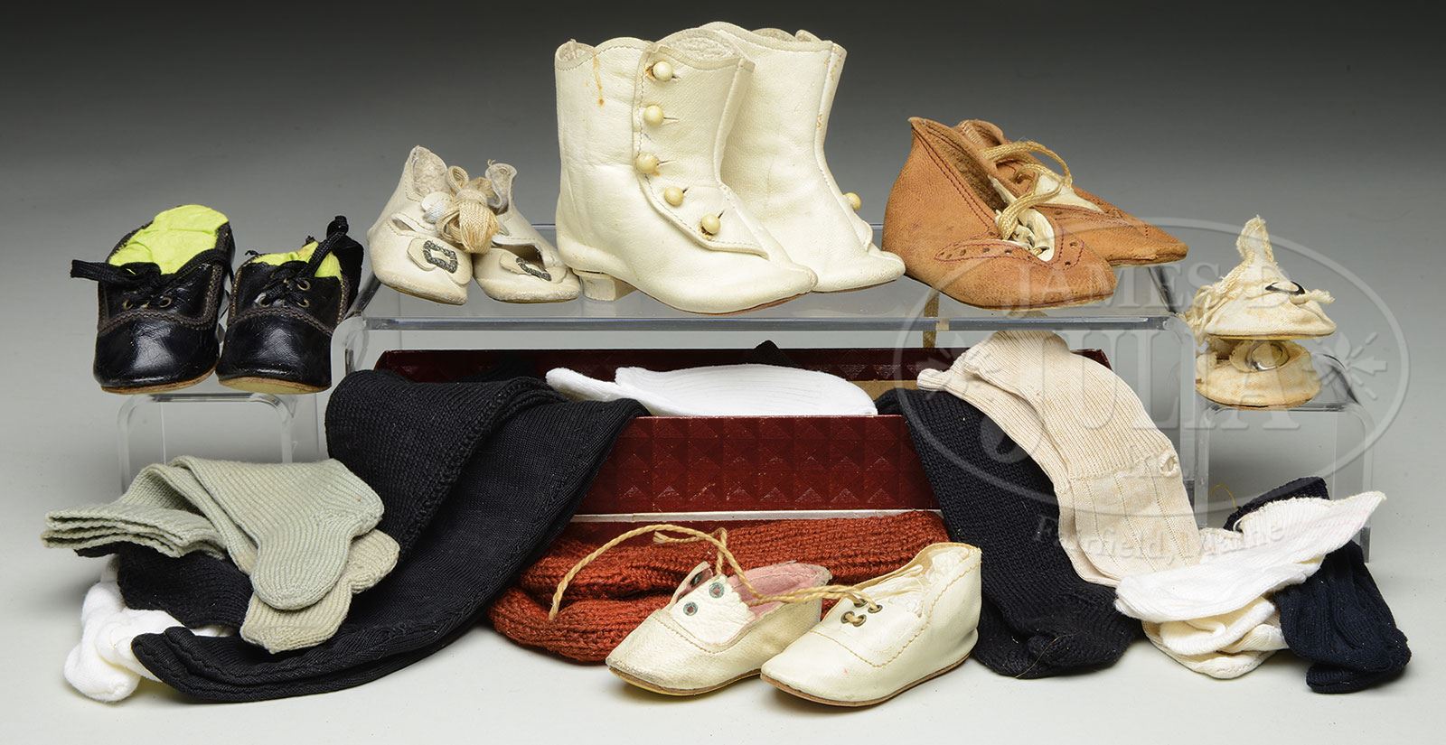 LOT OF ANTIQUE DOLL SHOES AND STOCKINGS.Lot consists of 6pr of doll shoes, made of leather, canvas and cloth, circa 1890 to 1930 as well as 10pr doll stockings of similar vintage. PROVENANCE: The Madelyn Trotter Collection. CONDITION: Very good to good. 1-14485 (500-700) – Lot 1246 Auction: Advertising, Toy & Doll Auction - Fall 2014 Please Note: All prices include the hammer price plus the buyer’s premium, which is paid by the buyer as part of the purchase price. The prices noted here after the auction are considered unofficial and do not become official until after the 46th day. |