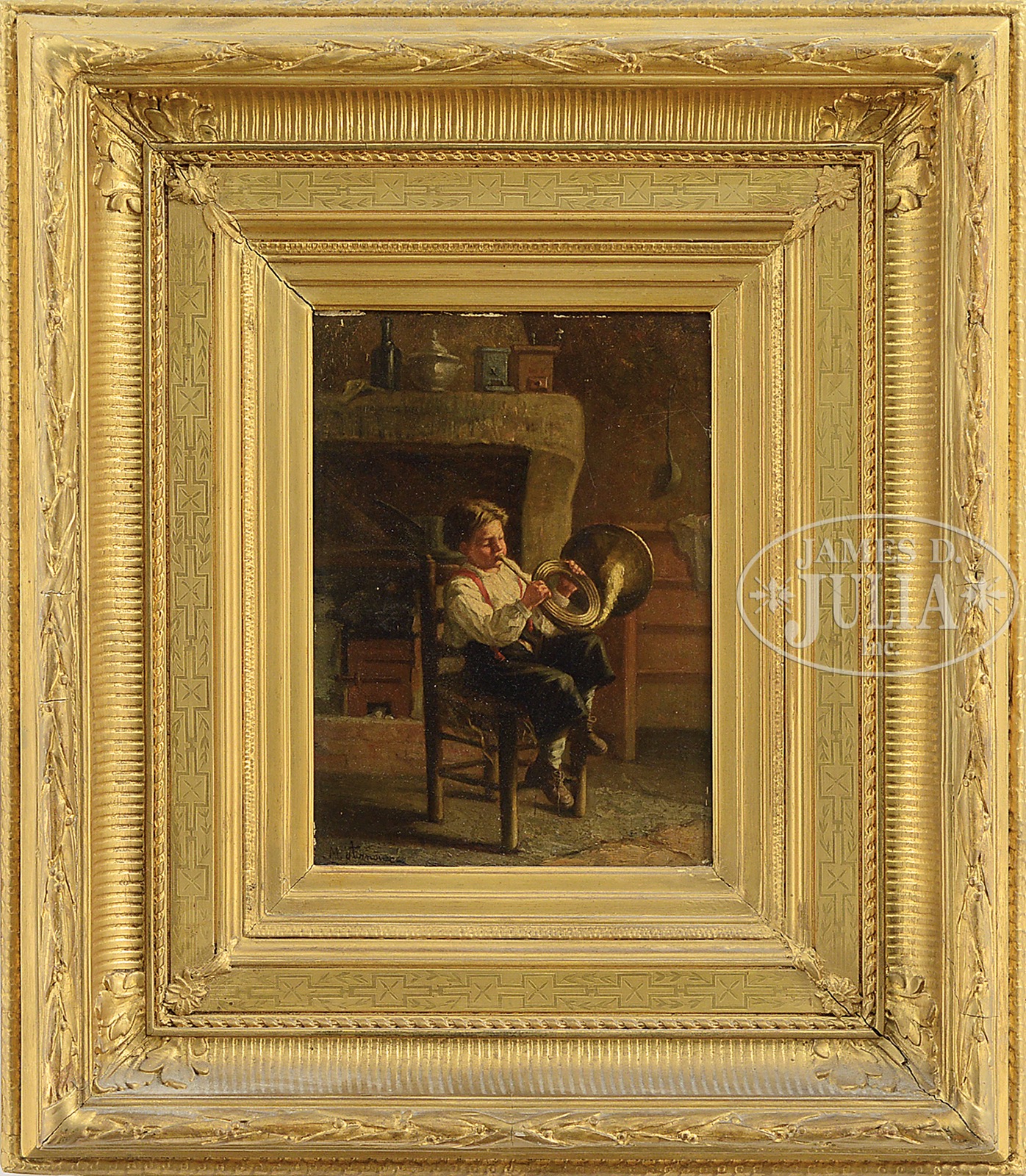 MICHEL ARNOUX (French, 1833-1877) TWO WORKS: BOY WITH KITTEN BY THE FIRE AND BOY PRACTICING HORN.Oil on panels Housed in period giltwood frames Signed lower left “M. Arnoux” The first numbered 378 on verso SIZE: 8-1/2″ x 6-1/4″. Overall 17-1/2″ x 15-1/2 CONDITION: Good both with discolored varnish and frame abrasion 51348-13 (2,500-3,500) – Lot 1246