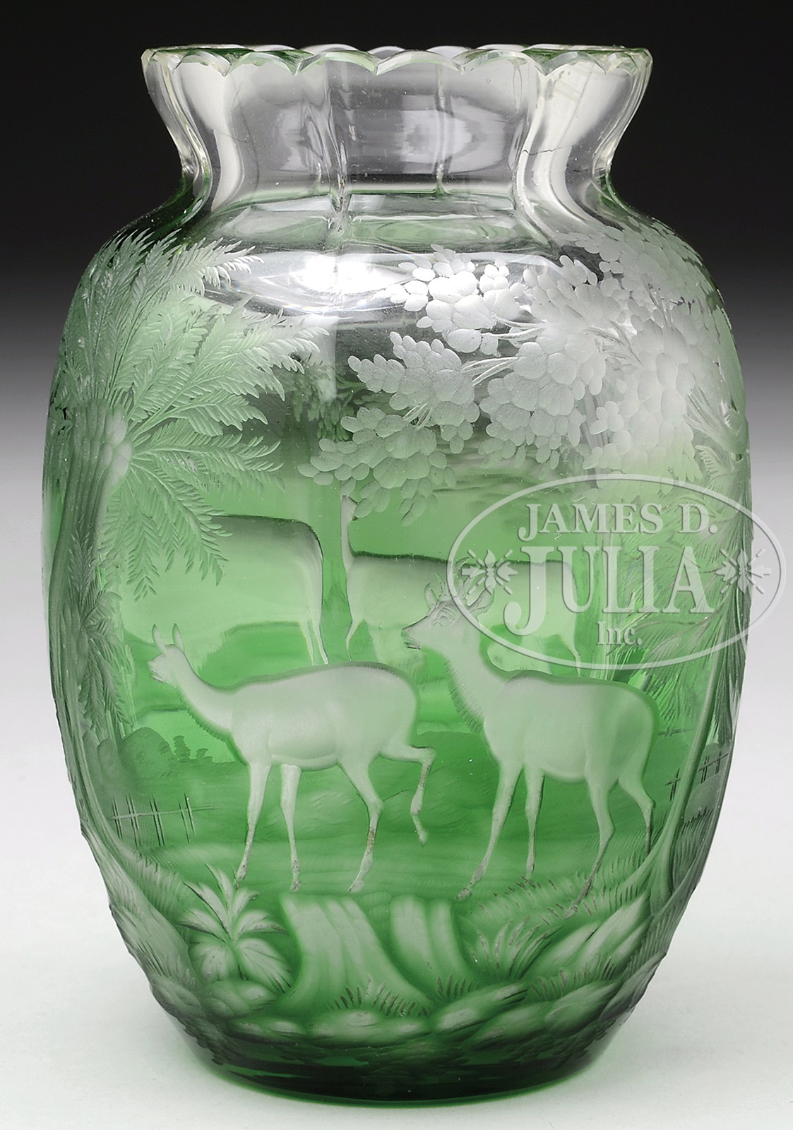 VERY FINE CUT OVERLAY BOHEMIAN VASE WITH WOODLAND SCENE.Very fine green cut-to-clear vase with four deer, one with full rack, and delicately carved woodland vegetation. Heavy glass vase with cut scalloping on top and ground base. Bohemian, probably Moser. SIZE: 5″ T. CONDITION: Very good. 7-74447 (200-400) – Lot 1248