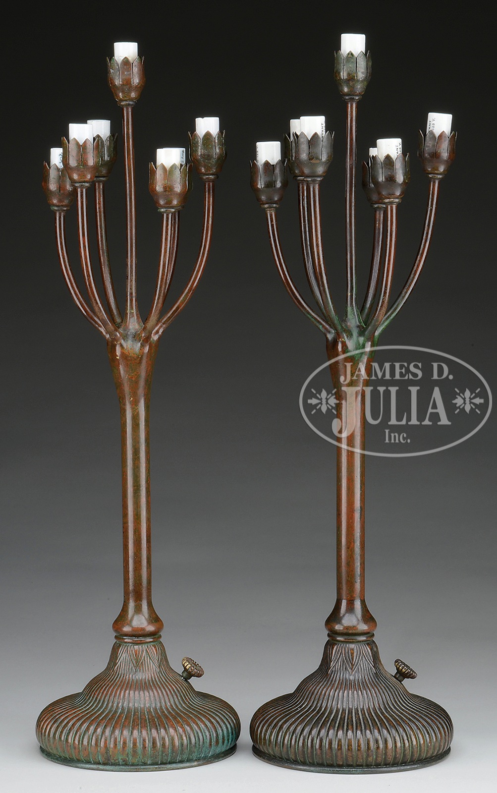 PAIR OF TIFFANY STUDIOS LILY LAMP BASES.Pair of Tiffany Studios lamp bases have vertically ribbed platform foot supporting a cylindrical stem with 7 arms terminating in bronze flower form lily shade holders, each having original porcelain sockets. Bases are finished in rich brown patina with green highlights. Signed on underside “Tiffany Studios New York 29721″ along with The Tiffany Glass & Decorating Company logo. SIZE: 21-1/2” t. CONDITION: Very good to excellent, with minor wear and discoloration to patina, re-wired with appropriate cloth cord. 49778-17 (10,000-15,000) – Lot 1248