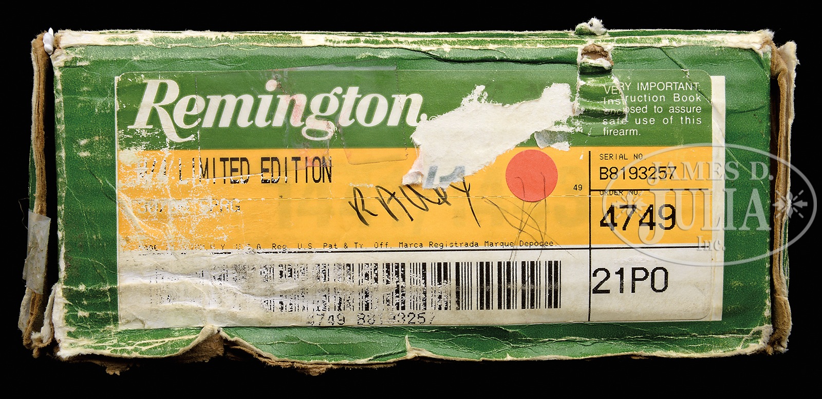 SN B8193257. Cal. 30-06. 22-1/2″ rnd bbl, ramp front & adjustable ramp rear sight. Receiver with gold inlaid game scenes, left side hunters in canoe facing bear, right side with gold inlaid “Model 8” & “Model Four”. Center inscription in stylized gold oval reads “REMINGTON ARMS COMPANY / LIMITED EDITION / ONE OF FIFTEEN HUNDRED / 1906 / 1981”. Plain walnut, fleur-de-lis pressed checkering on capped pistol grip. Hard rubber buttplate. Gun is accompanied by its factory box identified by SN on end label. CONDITION: Very fine. Gun appears “near new”, most likely unfired since leaving factory. All factory finishes, only one tiny mark on lower right edge of receiver. Box is tattered, end label scuffed but SN markings clear. 50958-13 TJW (1,250-2,000) – Lot 1248