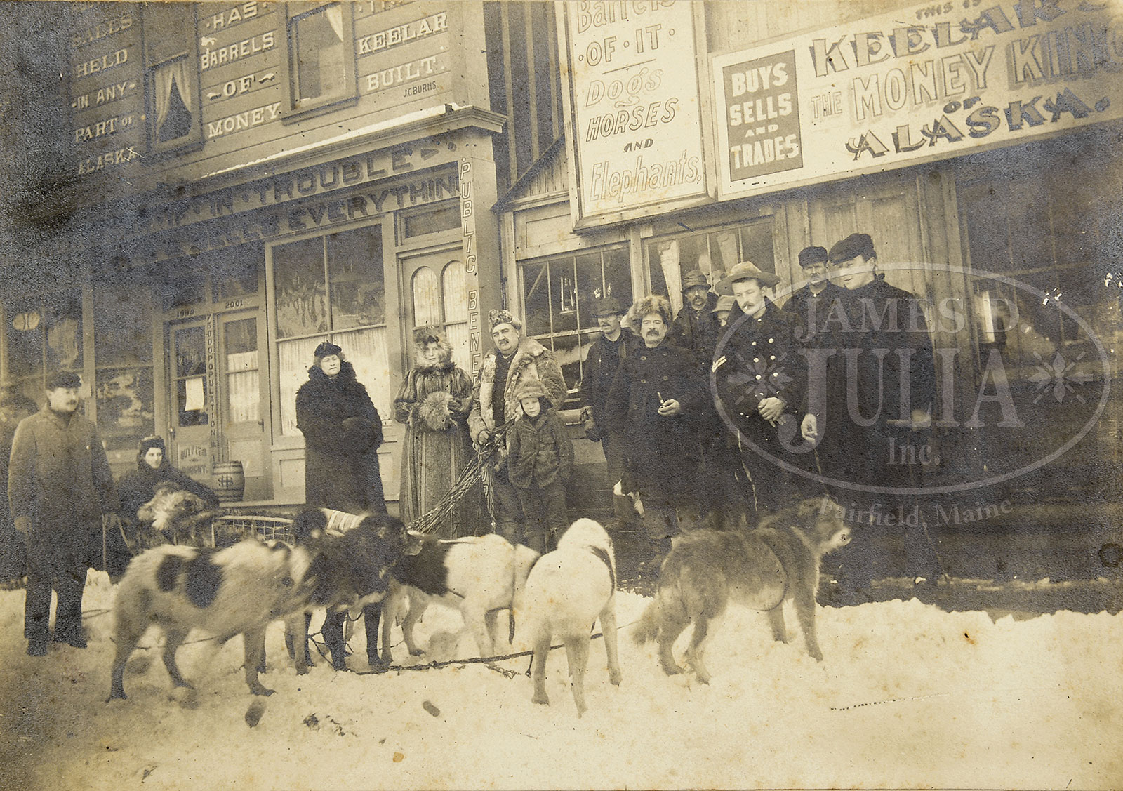 EXCEPTIONALLY RARE, UNIQUE AND FINE SILVER AND IVORY MOUNTED SAMUEL BELL BOWIE KNIFE, CIRCA 1835.Samuel Bell no doubt is among the finest and most unique craftsmen of Bowie knives known to America and his iconic knives are highly sought. There are only about 25 examples of his work known and this unique example is among the few identified to owner. Samuel Bell ran an ad in the Knoxville, TN Register in 1846 “GOLD AND SILVER MOUNTED BREAST KNIVES, MANUFACTURED SUPERIOR TO ANY MADE IN THE UNITED STATES…” This may be the only Samuel Bell Bowie that truly fits the description in this ad, as instead of a frog button, there is a large 2″ silver T-bar pin found to attach inside the breast of a coat. This is the only example known, otherwise this classic early ivory mounted knife exhibits all of Bell’s trademark characteristics including his unique engraving, though less profuse on this example possibly early feature. Knife measures 12-1/2″ overall with 8-1/4″ fullered spear-point blade with sharpened 5″ beveled false edge. The silver scabbard form fits blade in unique style with groove in scabbard fitting the 3-1/2″ fuller. Grip is semi-coffin shaped with silver engraved rectangular ferrule and tombstone shaped silver engraved pommel. The tapering rectangular grip is carved ivory with three panels having long, carved raised flutes and the main panel with raised checkered panel with inlaid silver pins. Bell Bowies made in Knoxville typically have forged bolsters and later in Texas do not. This knife most likely made early in Knoxville, TN and possibly among the earliest as there is a simulated forged bolster which is actually a 1/2″ turned silver bolster fitted between ricasso and grip, along with threaded capstan rivet, not seen on any other Bells. The knurling on either end is in suite to rectangular base of ferrule. This knife was orig purchased as being the property of Col. F. T. Keelar, a wealthy, prominent citizen and merchant during the Gold Rush in Skagway, Alaska. There is an interesting orig 8″ advertising photograph of Keelar and his storefront with large painted marquees; his card states he “owns mines, saw mills, timber lands, town sites, steam boats and more land than any man in Alaska, buys gold, loans money, sells exchange, daily pack trains, stage lines and dog teams…” This is a great knife owned by a colorful Alaskan entrepreneur. Special Note: This item(s) contains plant or animal properties that may be covered by the Endangered Species Act (ESA). We have taken care to ensure that this item(s) meets the standard for sale under the ESA. However, certain states and other countries have laws that are more restrictive than the ESA. It is the bidder’s responsibility to ensure that it is lawful to purchase or transport this item(s) into their state, and to obtain the necessary import and export approvals. Delay or failure to obtain any such permit or approval does not relieve the buyer of paying for the item(s) and consummating the purchase. CONDITION: Knife overall is fine with blade showing orig tool marks, grey/white overall light staining and pitting. Silver mounts and scabbard have several small dents. The unique round ball sheath tip has large dent on bottom as seen in photos. “Certifiable antique ivory” grip has hand worn patina, ivory patina, several hairline cracks that do not effect esthetics. Threaded tang protrudes about 3mm through capstan rivet which is knurled in suite to bolster. 50412-81 (50,000-70,000) ESA – Lot 1248