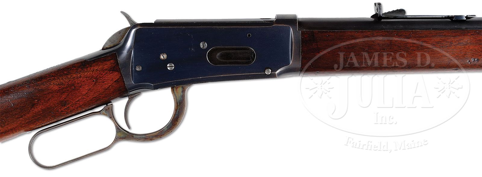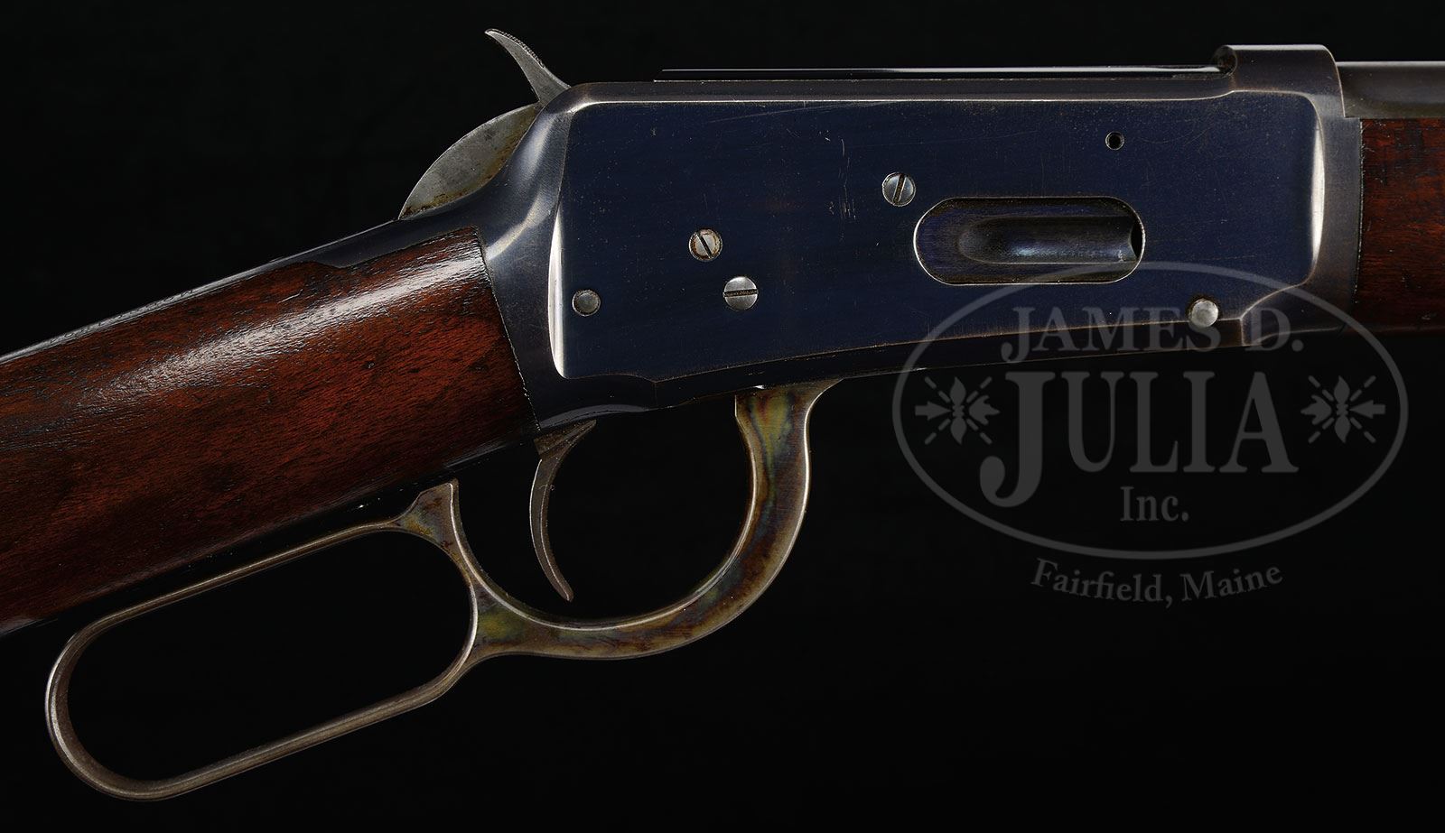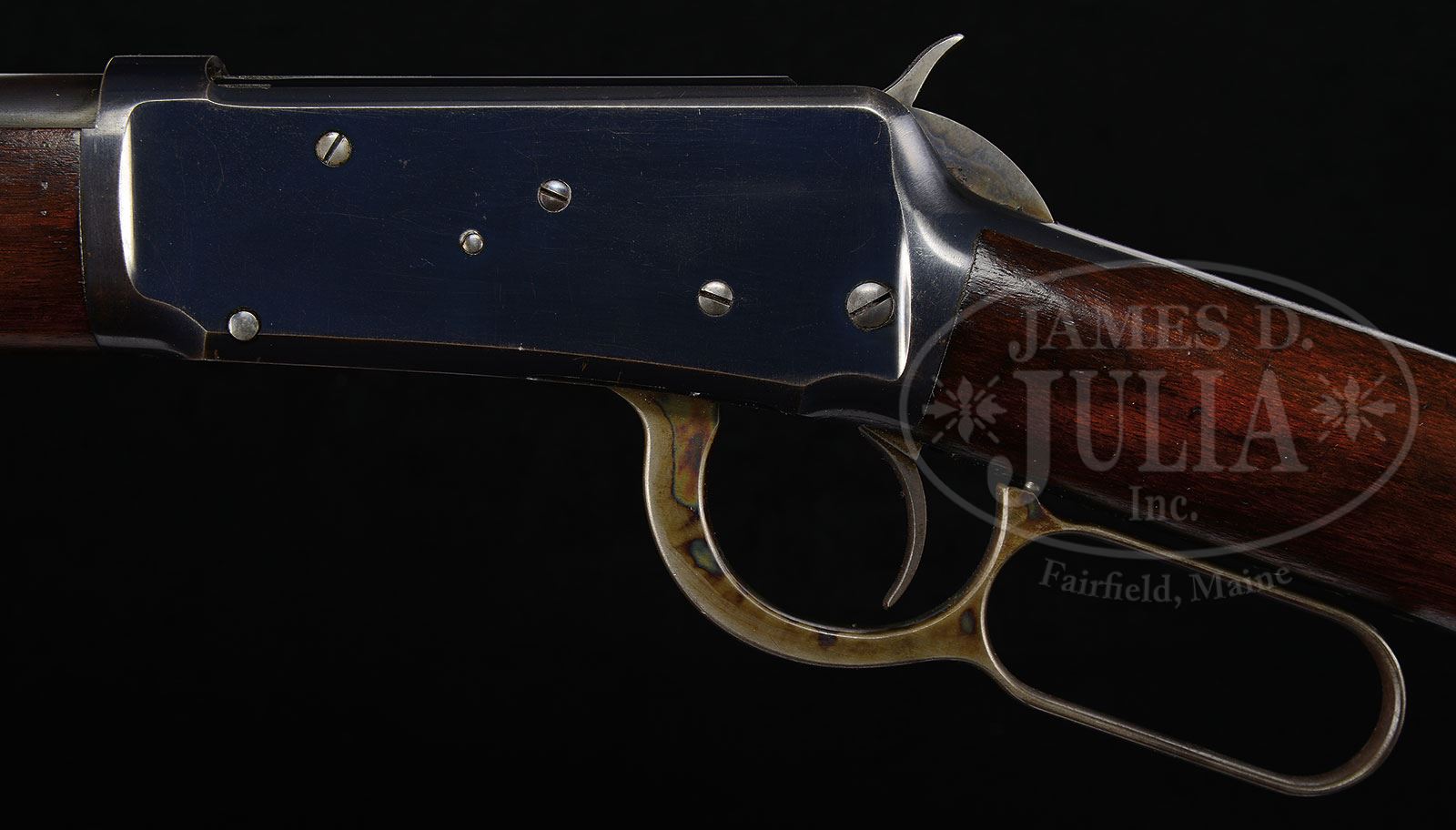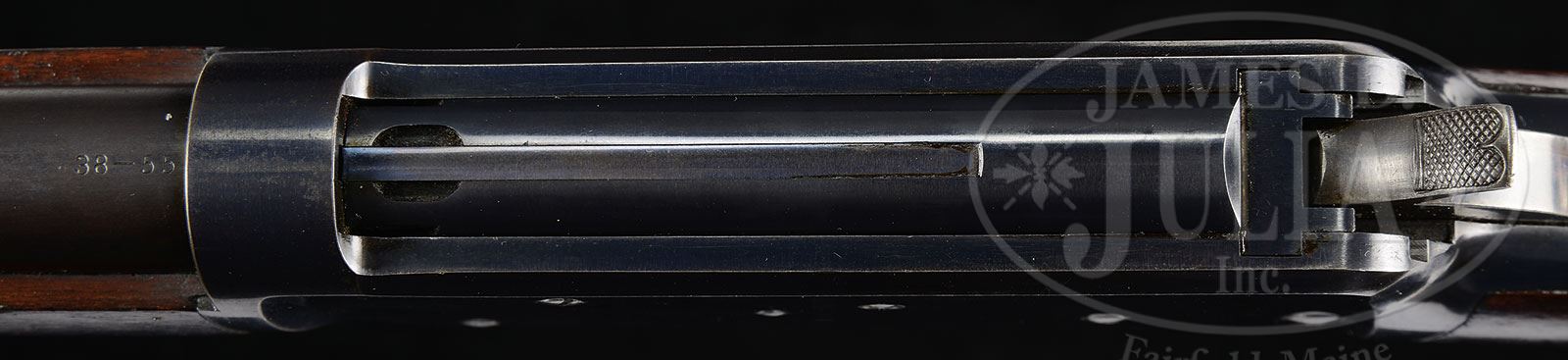 EXTREMELY RARE WINCHESTER 1ST MODEL 1894 LEVER ACTION RIFLE.SN 679. Cal. 38-55. Standard grade rifle with 26″ rnd bbl, full magazine, half nickel front sight and semi-buckhorn rear sight with serrated edges. Receiver is 1st type with external cartridge guide screws. Mounted with nicely figured, slab sawed, uncheckered American walnut with straight stock and crescent buttplate. Right side of upper tang, under the wood is marked with the assembly number “557” which number is also found in top tang channel of buttstock. Buttplate is not numbered but there is little doubt that it has been in place the entire life of the rifle. Accompanied by a Cody Firearms Museum letter which identifies this rifle in cal 38-55 with rnd bbl and plain trigger, received in warehouse Nov. 24, 1894 and shipped Jul. 11, 1895 to order number “15314”. The 1st Model ’94 was produced sporadically in the first two or three years of production with an unknown number having been made. Of those few survive today in any condition especially in such high condition as found here. CONDITION: Extremely fine, all matching as noted above. Bbl & magazine tube retain about 98% orig factory blue; receiver & loading gate also retain about 98% orig blue; hammer retains virtually all of its orig case colors, slightly faded; lever retains bright case colors on the sides, faded on the outer faces. Buttplate retains case colors turn silver and the forend cap about 60% flaked blue. Wood is sound with light nicks & scratches and overall retains about 98% orig varnish with some dulling on the forearm. Mechanics are crisp; very bright shiny bore. 4-47936 JR25 (20,000-30,000) – Lot 1249 Click here to view provenance