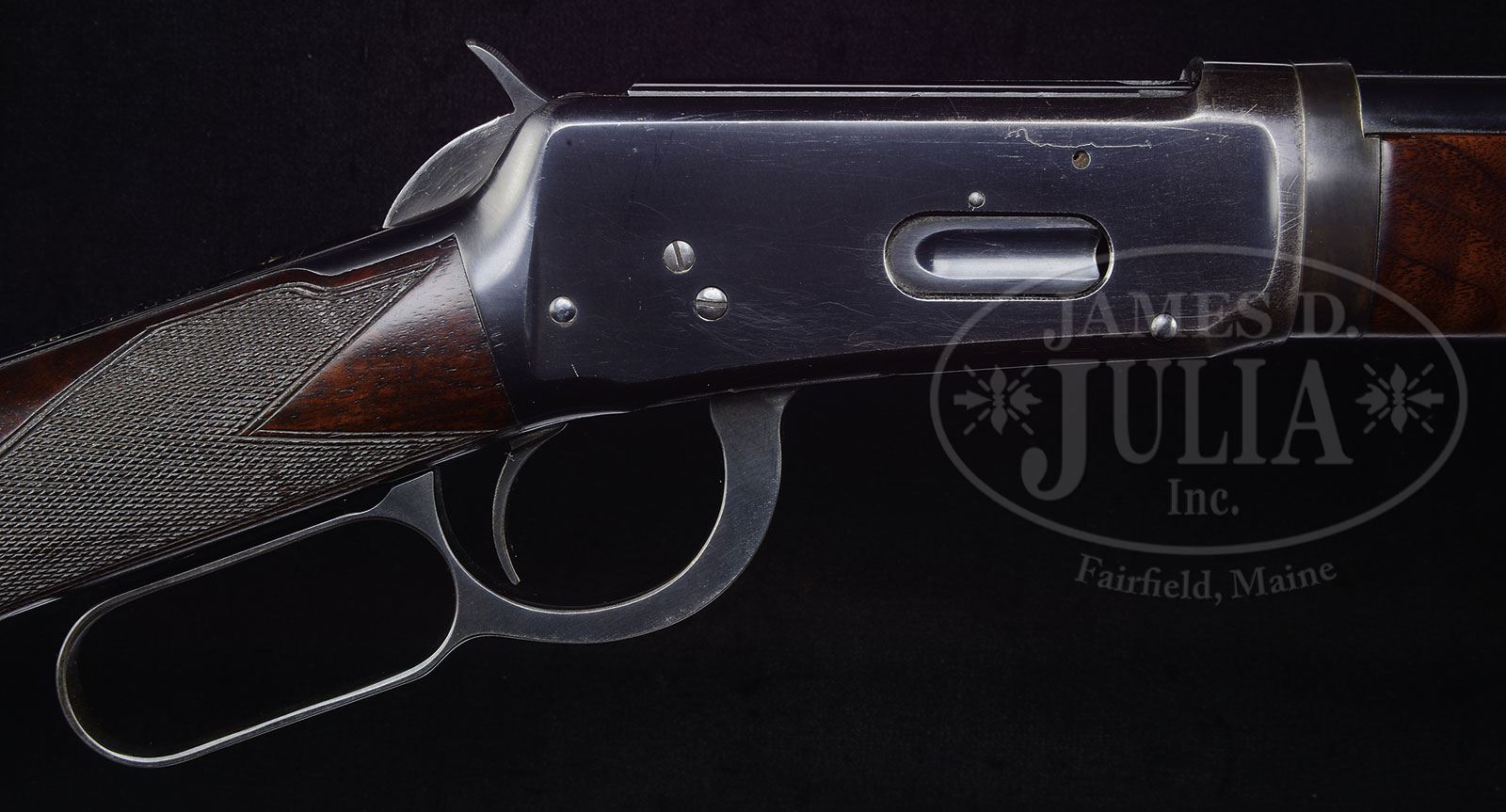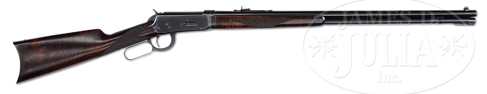 SN 947401. Cal. 32 Winchester Special. Beautiful deluxe rifle with 26″ rnd bbl, full magazine, takedown, Lyman front sight and semi-buckhorn rear sight. Mounted with about 2X American walnut with H-style checkered forearm and straight stock with crescent buttplate. It appears that this rifle was produced in about 1924 in the waning years of lever action popularity after the advent of the more powerful bolt action rifles. By 1924 there were few full length rifles being produced and of those extremely few in takedown deluxe configuration. By that time these rifles were primarily used for hunting and this rifle would likely have belonged to someone of reasonable wealth or great importance. It might have been a special presentation to someone. CONDITION: Very fine to extremely fine. Bbl & magazine tube retain about 98% crisp orig blue, as does the forend cap; takedown ring is a dull blue, possibly with some light touch-up blue added; receiver retains 97-98% bright orig blue with sharp edge wear and a couple of small scratches; bottom & side front edges are lightly thinned. Wood is sound with a few light handling marks and retains most of a lightly restored finish. Buttplate may be restored. Mechanics are crisp; bright shiny bore. 4-47940 JR26 (15,000-20,000) – Lot 1250