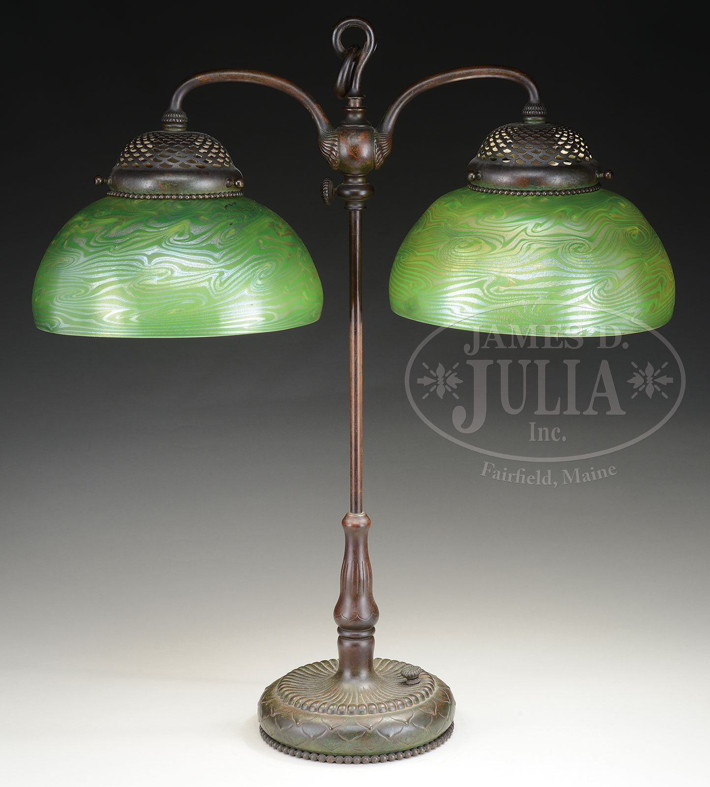 TIFFANY STUDIOS ADJUSTABLE DOUBLE STUDENT LAMP.Tiffany Studios double student lamp has bronze base with artichoke decoration surrounding the foot, leading to a simple adjustable stem with two curved arms supporting acid etched bronze shade holders. The lamp is completed with two Tiffany favrile glass dome shades with gold iridescent King Tut design against a green iridescent background. The iridescence shows nice pink and blue flashes. Base is signed on the underside “Tiffany Studios New York 28600” along with the Tiffany Glass & Decorating Company logo. One shade is signed in the fitter “L.C.T.”; the other is unsigned. SIZE: Shades 9-3/4″ dia. Lamp 25-1/2″ to top of shaft. PROVENANCE: From the Unreserved Estate of Lynda Cunningham. CONDITION: Very good to excellent with some wear and discoloration to color on base. Rewired with appropriate cloth cord. 51361-79 (4,000-6,000) – Lot 1250