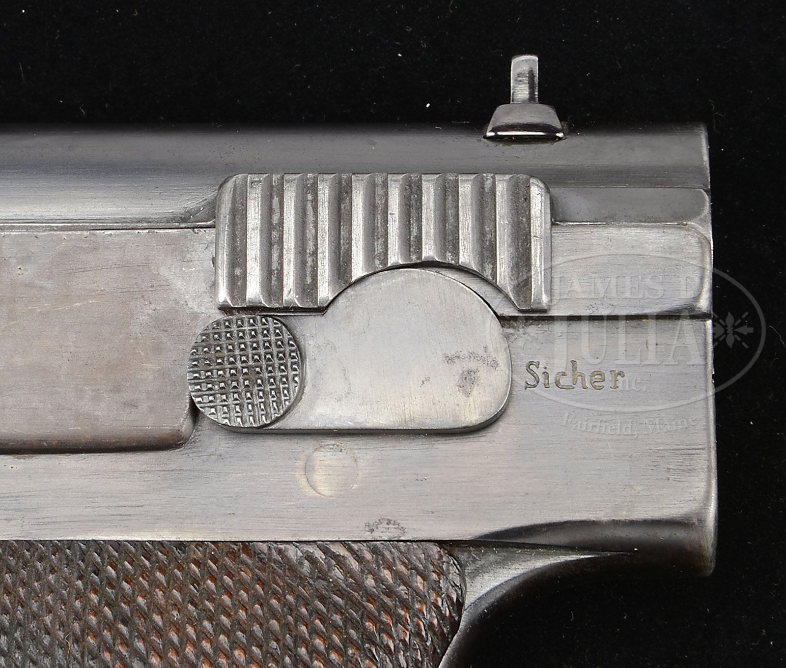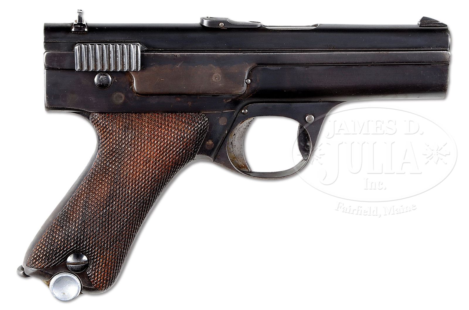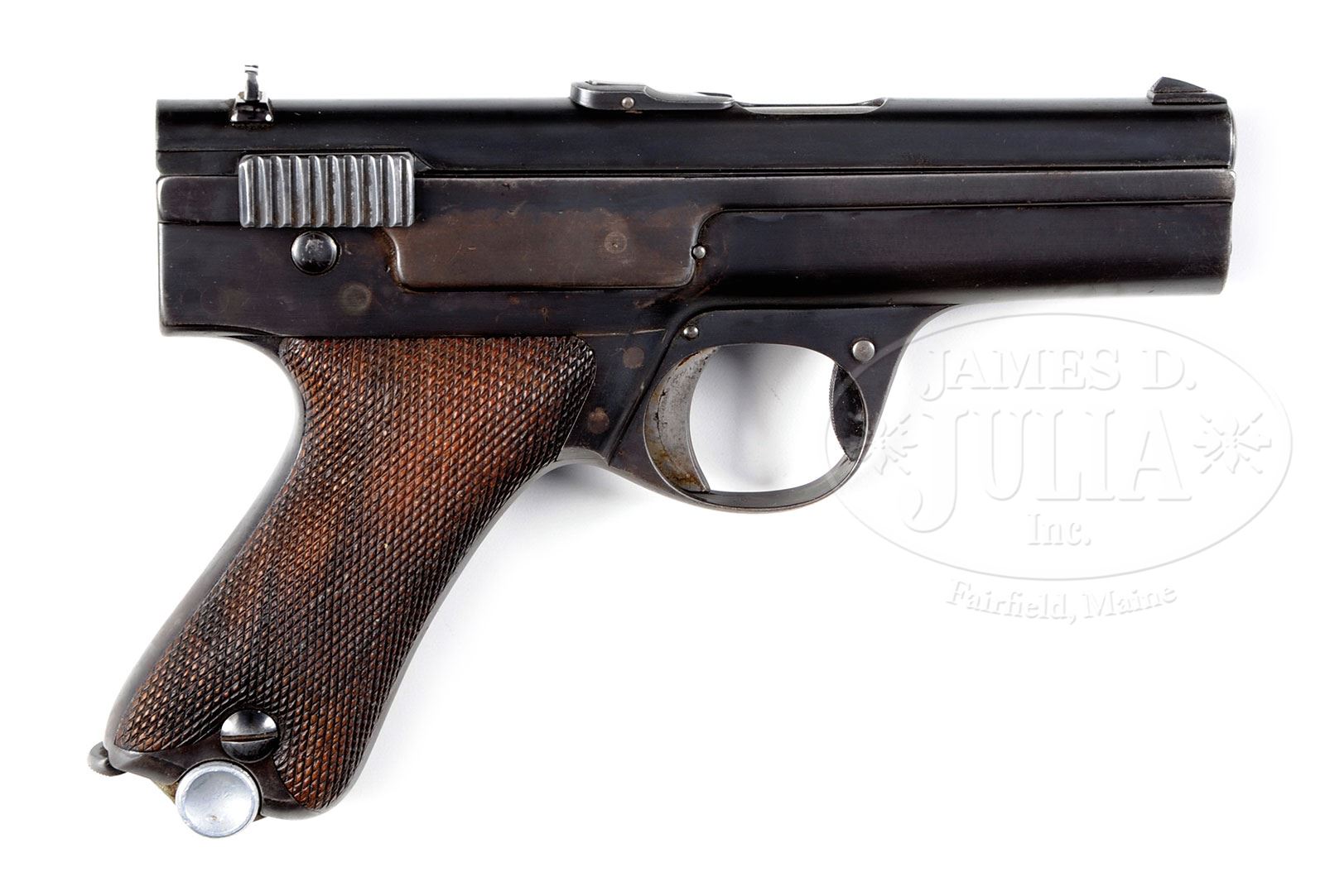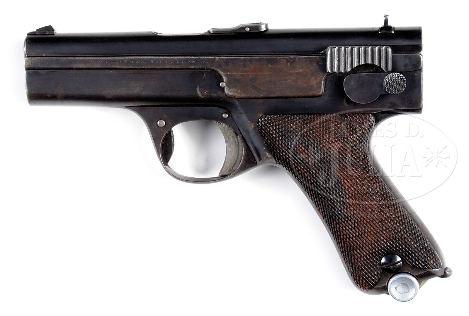 *◊ RARE SIMSON PROTOTYPE M1929 BLOWBACK PISTOL IN 9MMP.SN 7A. Cal. 9mm Parabellum. Extremely rare, probably unique, prototype Simson single action blowback pistol, now numbered “7A” for purpose of importation. Made with 3-3/4″ bbl, fixed front sight & drift adjustable rear sight. Loaded indicator prominently mounted on top of the slide that has raised gripping serrations. On the left side of the frame, shallowly engraved by hand and partially effaced, is “SIMSON & Co. SUHL, WAFFENFABRIK.”. On the left tang is a large rotating safety lever. Pushing the lever forward uncovers the hand inscribed “Sicher” translating “Safe”. Extending into the forward trigger guard is a serrated oval lever that is pushed forward for takedown. Modified Haenel Schmeisser Patent P. 08 magazine with a nickel plated body that has been filed at the top and the checkering on the button removed. A small section has also been removed from the lower spine for retention by a butt-mounted release. The base of the magazine is unmarked. Pleasingly contoured grip panels are uniformly checkered & retained in place by Simson inspected screws. Probably designed and produced ca. 1928-29 by Simpson (then the only permitted manufacturer of military smallarms in Germany) in response to the re-armament requirements of the Prussian Police that resulted in the 9 mm P.08 being adopted for police service. PROVENANCE: Collection of Dr. Geoffrey Sturgess. CONDITION: Approx 80-90% orig rust blue with patchy discoloration but no pitting. Same consideration applies to grip straps. The stainless steel body of the Haenel Schmeisser magazine is bright with modifications as previously detailed. Surprisingly nice and entirely orig grips showing only minimal diamond blunting. No cracks or chips. Near mirror bore with only minimal frosting. Perfect manual function, with a tightly fitting magazine that should be easy to correct. 4-52531 LMA104 (20,000-30,000) – Lot 1252