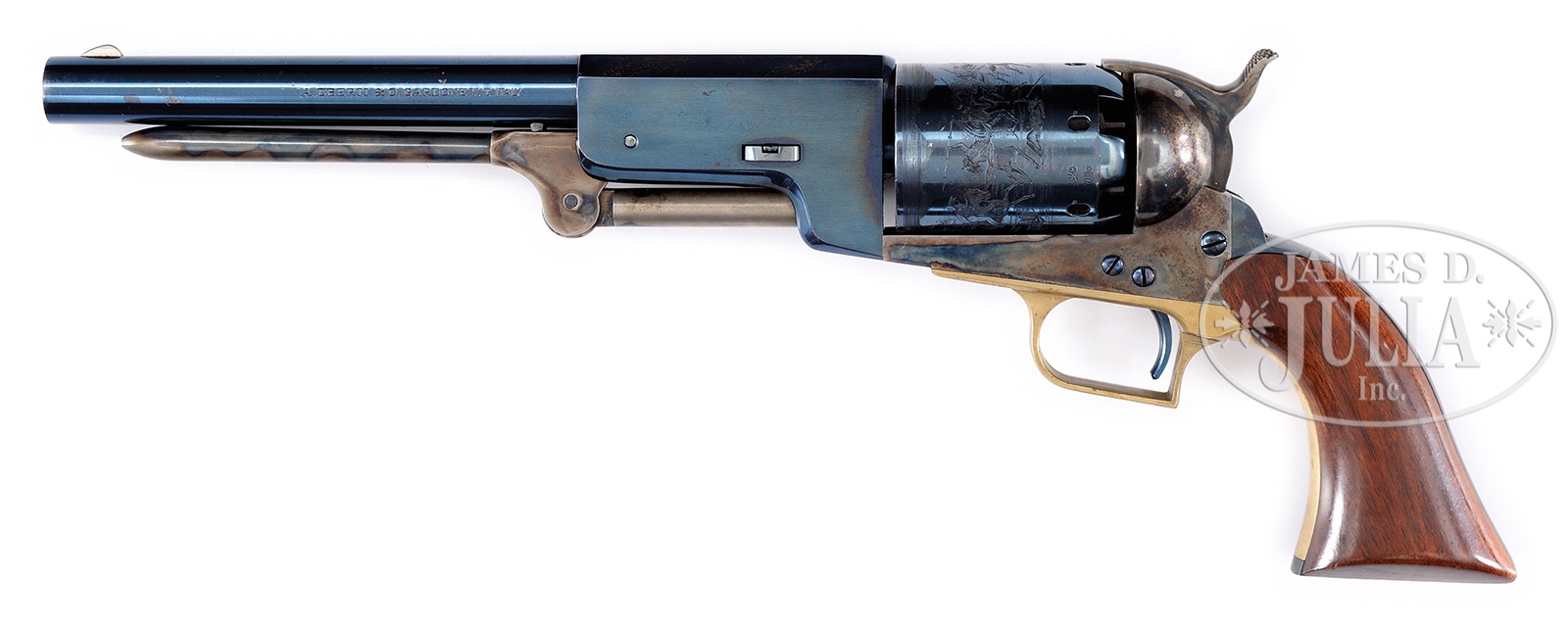 A. UBERTI COLT 1847 WALKER REPRODUCTION.SN 01810. Cal. 44. 9″ bbl with German silver front blade sight, left side marked “A. Uberti & C. Gardone V. T. Italy”. Right side marked “SMLS Inc.-Angleton-Texas”. Also marked “US/1847” over wedge screw. Six shot cylinder with excellent Indian fight scene, case hardened frame and hammer, blued trigger, backstrap and butt. Case hardened loading lever. PROVENANCE: The Estate of G. W. “Bill” Stewart of Sonora, Texas. CONDITION: Excellent. Bbl retains 90-95% bright orig blue with minor flaking on top and on left side. Cylinder retains 97-99% orig blue with a couple of light areas of flaking and toning. Frame and hammer retain most of their orig case hardening. Backstrap with approximately 60% orig blue toned from orig owner’s palm print. Brass trigger guard is excellent. Mechanics are crisp with brilliant and shiny bore. 49973-96 JSL77 (400-1,000) – Lot 1252