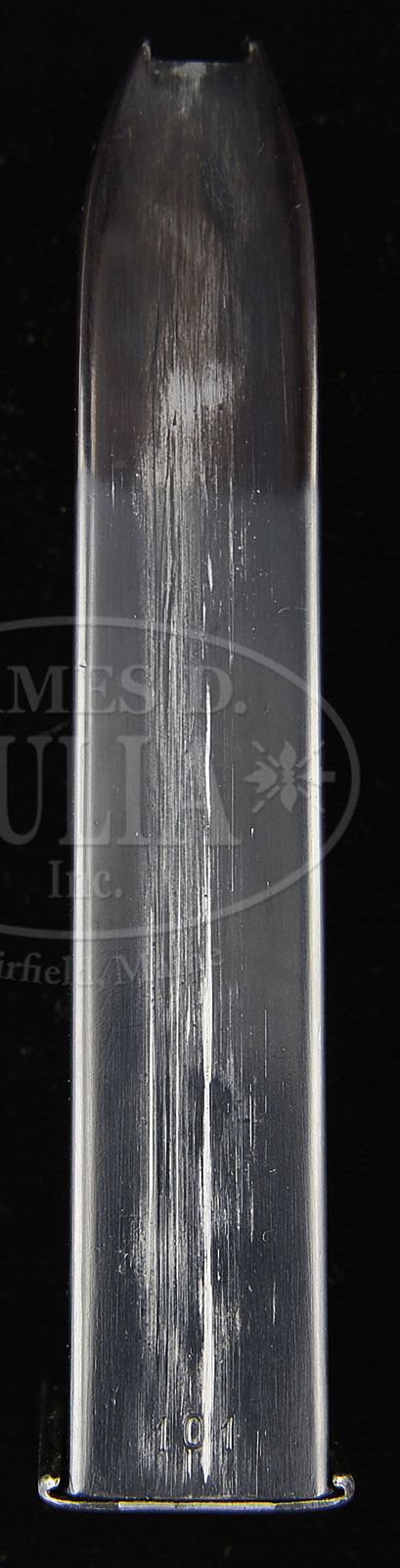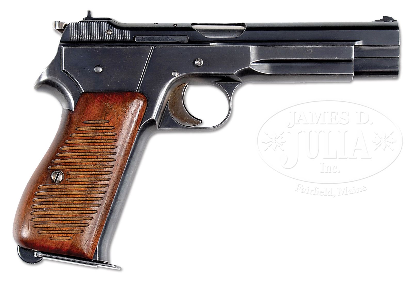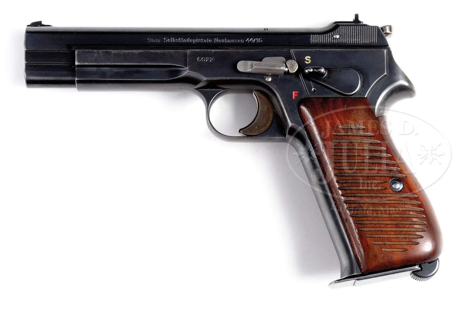 *◊ EXTRAORDINARILY RARE SIG NEUHAUSEN PROTOTYPE MODEL P44/16 SEMI-AUTO PISTOL.SN 6022. Cal. 9 mm. Blue finish with 4-3/4″ bbl, fixed sights and left side of slide marked “9mm Selbstladepistole Neuhausen 44/16”. Top of slide, back of ejector port, has a loaded indicator. Left side of frame has the serial number. Frame is extra thick to accommodate the double stack 16-rd magazine with reinforcements at the top rear on each side. Slide lock/disassembly bar and thumb safety are also on the left side. The “S” for safe is in white and the “F” for fire is in red. Thumb safety is also a decocking lever. Pistol does not have magazine safety. Trigger, hammer and grip screw are straw colored. Mounted with coarse checkered 2-pc walnut grips and accompanied by one orig 16-rd magazine serial numbered “101”. Frame, bbl, slide, slide lock and grips are all matching numbered. No additional disassembly was effected to check for other matching numbers. Grips are retained by a single screw with dovetailed front edges that fit into the frame. This pistol is pictured on pg 821 as part of figure 11-131 in The Borchardt & Luger Automatic Pistols, Gortz & Sturgess. The bbl lug has a machined J-shaped slot which constrains the barrel to initially recoil parallel to the sight axis before the curved section acts to cam the bbl rear downward during recoil and extraction and returns it to the lock position. This was the SIG patented modification to the Browning HP pattern recoil lug which makes for a substantially more accurate shooting pistol. Also the pistol has full length frame & slide rails which further stabilizes the slide to increase accuracy. This would have been a very comfortable and accurate pistol to shoot. Very few, if any, of these pistols are known outside of European museum & private collections and this may be the only example in the United States, only eight 16 shot prototypes (sns 6018 – 6025) being made in 1944 for Swiss Army trials to find a replacement for the Parabellum pistol. PROVENANCE: Henk Visser Collection; Collection of Dr. Geoffrey Sturgess. CONDITION: Very fine to extremely fine. Overall retains about 96% strong orig blue finish with light wear and thinning on the edges and forward sides of the frame. Frontstrap is also slightly thinned. Straw colored parts retain most of their bright gold finish. Grips are sound, showing light wear and retain most of their orig oil finish. Mechanics are crisp. Brilliant shiny bore. Magazine shows light wear on the body. 4-52539 JR223 (25,000-40,000) – Lot 1253